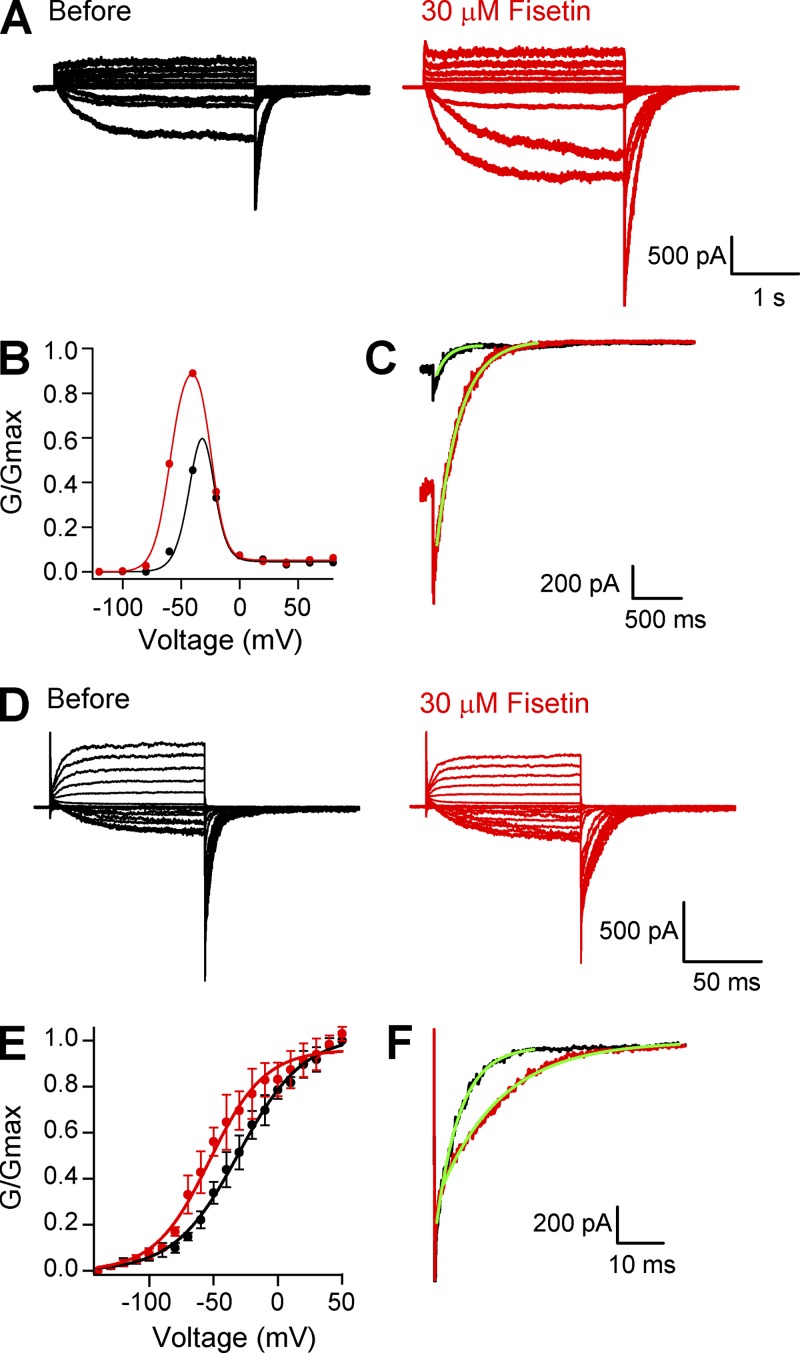 Figure 5. Fisetin regulated mEAG1 channels lacking their amino-terminal or post-CNBHD regions. (A) Representative current traces from mEAG1 Δ2–173 channels, recorded in the inside-out configuration of the patch-clamp technique, in the absence (black) and presence (red) of 30 µM fisetin. Patches were held at −100 mV, and currents were evoked by 3-s voltage steps to depolarizing potentials ranging from −100 to +100 mV, in 20-mV increments, and returned to −100 mV for 1 s. (B) Representative conductance–voltage relationships of mEAG1 Δ2–173 channels with 0 (black) or 30 µM fisetin (red) fit with the product of two Boltzmann functions. For both curves, the V1/2i, si, and sa were held constant at −4.5, 5.9, and 7 mV, respectively. For 0 fisetin, the V1/2a was equal to −19.8 mV, and for 30 µM fisetin, the V1/2a was −39.4 mV. (C) Tail currents at −100 mV after a step to −40 mV were fit with single exponentials (green lines) to give time constants of 116 ms without and 239 ms with 30 µM fisetin. (D) Representative current traces of mEAG1 Δ821–989 recorded in the absence (black) and presence (red) of 30 µM fisetin. Patches were held at −100 mV, and currents were evoked by a series of 100-ms voltage steps ranging from −140 to +50 mV, in 10-mV increments, followed by a 100-ms voltage pulse to −120 mV. (E) The averaged conductance–voltage relationship of mEAG1 channels lacking their post-CNBHD region, EAG1 Δ821–989, recorded in the inside-out patch configuration in the absence (black) and presence (red) of 30 µM fisetin (n = 4). The data were fit with Boltzmann functions to give a V1/2 of −31.9 mV without and −50.6 mV with 30 µM fisetin. (F) Tail currents at −120 mV after a step to +50 mV fit with single exponentials (green lines) to give time constants of 5.2 ms without and 13.4 ms with 30 µM fisetin.