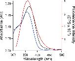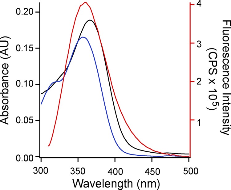 Figure 6. Absorption spectra for fisetin and quercetin overlap with the emission spectrum of tryptophan. Shown are the absorption spectra of 10 µM fisetin (blue) and quercetin (black) (left axis). Also shown is the emission spectrum of 4 µM of free tryptophan (red) excited with 295 nm (right axis).