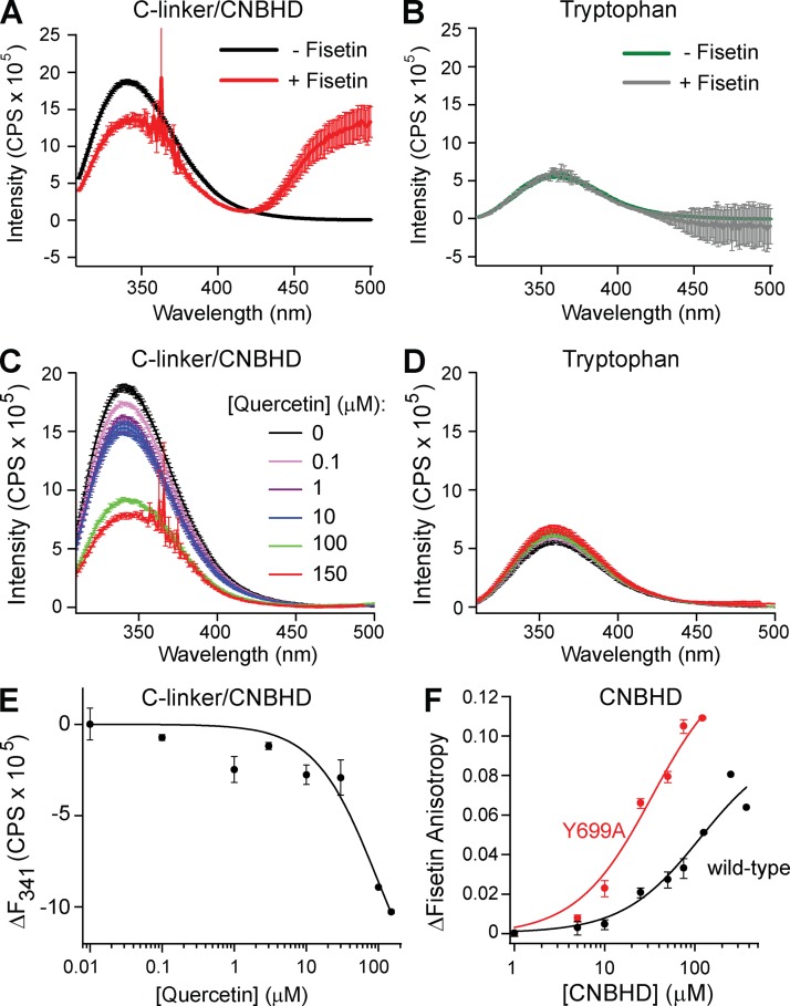 Figure 7. Quercetin and fisetin bound to purified CNBHD of mEAG1 channels. (A and B) The inner filter–corrected and background-subtracted emission spectra of 4 µM of purified C-linker/CNBHD (A) and 4 µM of free tryptophan (B) recorded with 0 or 100 µM fisetin as indicated. (C and D) The inner filter–corrected and background-subtracted tryptophan fluorescence emission spectra of 4 µM of purified C-linker/CNBHD (C) or 4 µM of free tryptophan (D) recorded with various concentrations of quercetin, as indicated. (E) Plot of the change in the peak emission fluorescence intensity (at 341 nm) of the C-linker/CNBHD versus total quercetin concentration. These data were fit with Eq. 6 to report an apparent binding affinity of 93 ± 69 µM. (F) Fluorescence anisotropy of fisetin plotted versus the total concentration of wild-type or Y699A mutant CNBHD. The data were fit with Eq. 7 to yield Kd’s of 111 µM for wild-type and 30 µM for the Y699A mutant.
