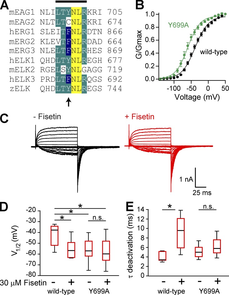 Figure 8. Fisetin did not potentiate mEAG1 channels with a mutated intrinsic ligand. (A) Alignment of the intrinsic ligand from each of the eight members of the KCNH channel family. Line on the top marks the boundaries of the intrinsic ligand, and the arrow on the bottom denotes the Y699 residue in mEAG1 channels. (B) The conductance–voltage relationship of wild-type (black) and Y699A (green) mEAG1 channels recoded in the inside-out patch configuration (n = 17). (C) Representative current traces from Y699A mutant channels recorded in the absence (black) and presence (red) of 30 µM fisetin. (D) Box plot distribution of the V1/2 of the conductance–voltage relationship for both wild-type and mEAG1 Y699A channels with 0 or 30 µM fisetin as indicated (n = 6–10). A two-way ANOVA reported differences between these four groups of data (P < 0.01). The Tukey–Kramer post-hoc test revealed significant differences between treatments, denoted with an asterisk. Treatments with nonsignificant differences are also indicated (n.s.). (E) Box plot distribution of the time constant of deactivation for both wild-type and mEAG1 Y699A channels with 0 or 30 µM fisetin as indicated (n = 6–10). A two-way ANOVA reported differences between these four groups of data (P < 0.05). The Tukey–Kramer post-hoc test also revealed significant and nonsignificant differences between treatments, indicated with an asterisk or n.s., respectively.