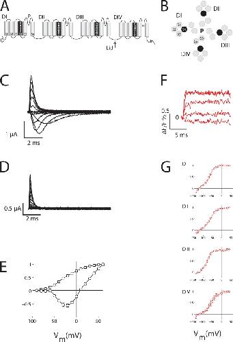 Figure 1. NaV1.4 channel ionic current, gating current, and site-specific fluorescent signals. NaV1.4 currents (black traces) were measured using cut-open oocyte clamp to achieve fast temporal resolution (Stefani et al., 1994) as described in Materials and methods. Changes in fluorescence magnitude (ΔF/F0; red traces) studied in four channels (DI-S216C, DII-S660C, DIII-L115C, and DIV-S1436C) after conjugation to TMRM. Groups of three to six cells reported as mean ± SEM in E and G. (A) Drawing of the NaV1.4 pore-forming subunit indicating four domains, each with six transmembrane segments; each S1–S4 group forms a voltage sensor, and the four S5–S6 spans are reentrant pore loops that create a single conduction pore. The S4 spans (light gray) are indicated (+) to have multiple arg and lys residues that carry the majority of the gating charge. “Lid” indicates hydrophobic triplet on the DIII–DIV linker that is responsible for fast inactivation. (B) Drawing represents the spatial arrangement of four voltage sensors around a central ion conduction pore. (C) Sodium currents. Activation and fast inactivation of ionic current are apparent with steps from a holding voltage of −100 mV to test potentials of −90 to +60 mV for 60 ms (10 ms shown) in 10-mV steps with a 10-s interpulse interval. For all recordings of ionic currents, gating currents were subtracted. (D) Gating current recorded as in C, with 2 µM TTX in the bath to block ionic current. (E) Channel current/voltage (I/V; circles) and gating current/voltage (Q/V; squares) relationships. Protocol as in C and D. Conductance was calculated by normalizing the current to the driving force (Erev = 7.9 mV), which was fit with a Boltzmann of the form 1/(1+ezFRT(V−Vmid)), giving a half-maximal voltage (Vmid) of −29.1 mV and z = 2.4. For the Q/V relationship, the fit gave Vmid = −27.5 mV and z = 1.1. (F) VCF measurements. Fast changes in fluorescence compared with baseline (ΔF/F0) for DI-S216C channels studied by applying steps from a holding potential of −120 mV to test potentials of −140 to 40 mV in 10-mV steps; traces at −140, −100, −60, −20, and 20 mV are shown. (G) Fluorescence/voltage (F/V) relationships for each of the four Nav1.4 domains. Fits as in E gave DI: Vmid = −74.6 mV and z = 1.3; DII: Vmid = −69.4 mV and z = 1.1; DIII: Vmid = −82.4 mV and z = 1.7; and DIV: Vmid = −70.6 mV and z = 1.5.