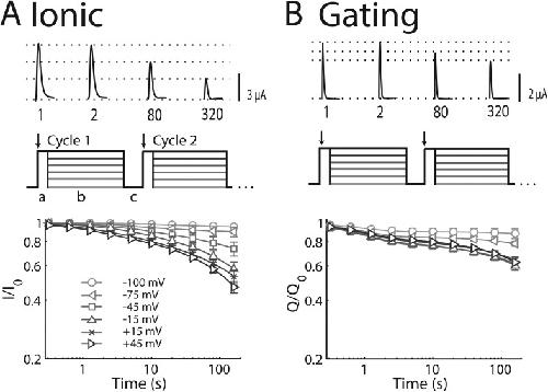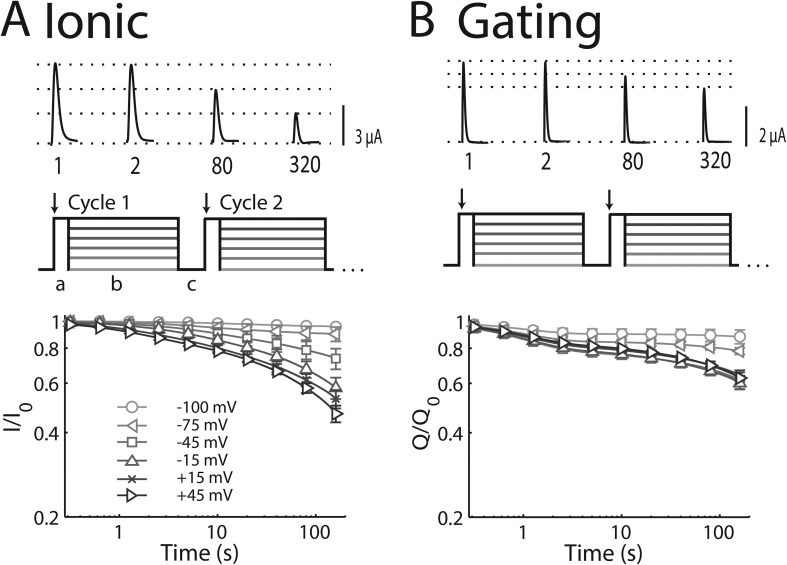 Figure 2. SI onset: Ionic and gating currents. Groups of 4–14 cells reported as mean ± SEM. (A) SI is probed by 320 repetitions of a triple-pulse protocol from a holding potential of −100 mV. A 5-ms test pulse to +45 mV was used to measure peak current (phase a); SI was induced by a 500-ms pulse at −100, −75, −45, −15, 15, or 45 mV (phase b); and a 30-ms pulse at −100 mV was used (phase c) to allow for recovery from fast inactivation before the next test pulse. Above protocol, sample traces from cycles 1, 2, 80, and 320 show progressive decrease in peak current with SI at +45 mV. Parameters for SI onset are reported in Table 1. (B) Loss of gating current with SI induced as in A. (Top) Sample traces from cycles 1, 2, 80, and 320 show progressive reduction in peak gating current with SI at +45 mV. (Bottom) Plot of the gating charge (Q, the integral of the gating current) with time at different potentials.