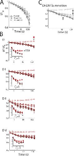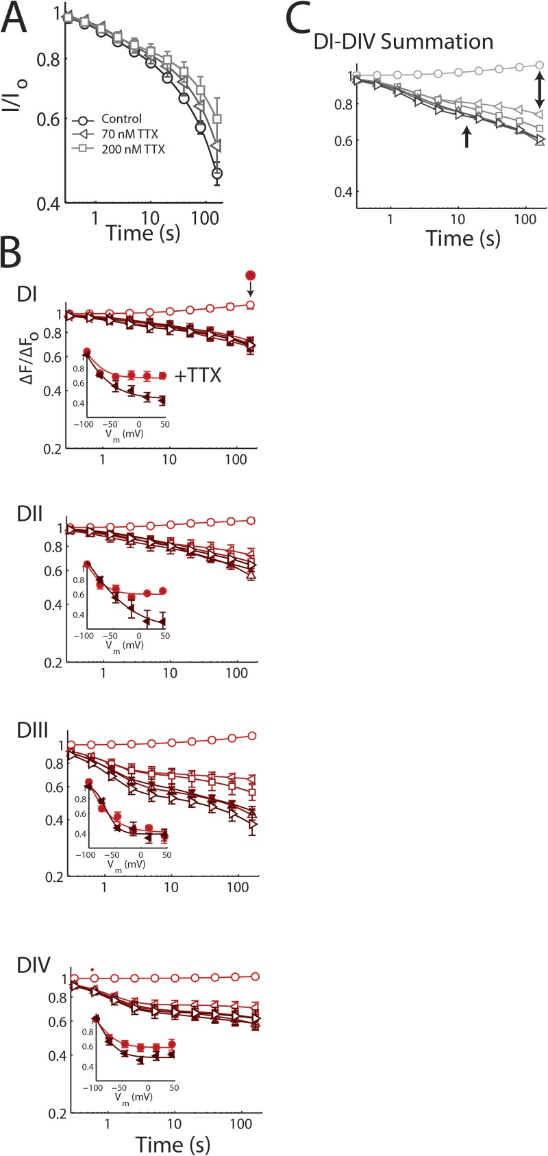 Figure 5. Immobilization of DI and DII voltage sensors is suppressed by TTX. Changes in the fluorescence magnitude (ΔF/F0) of TMRM conjugated to each domain via DI-S216C, DII-S660C, DIII-L115C, or DIV-S1436C in the presence of 2 µM TTX. The mean ± SEM for groups of 5–14 cells is reported. (A) Ionic currents. SI in wild-type channels in the absence and presence of the indicated levels of TTX by the protocol shown in Fig. 2 A. TTX inhibition decreases SI (P = 0.038 for 200 nM vs. control). (B) Fluorescence recordings as in Fig. 4 B with TTX. Parameters are shown in Table 2. DI and DII voltage sensors are significantly affected and are now reminiscent of gating currents. Insets compare immobilization for the indicated domain at 160 s with TTX (bright circles) and without TTX (dark triangles). (C) Expected gating charge immobilization based on fluorescence measurements. Each domain was assumed to carry 25% of the gating charge, and the traces represent the sum (see Results).