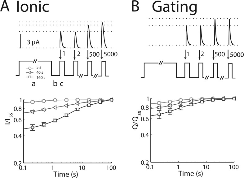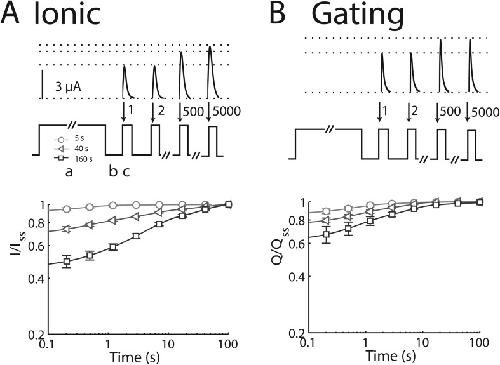 Figure 6. Recovery from SI: Ionic and gating currents. Changes in ionic and gating current as channels recover from SI. The mean ± SEM for groups of four to five cells is reported. (A) Sodium current. (Top) Recovery from SI is probed after induction pulses to +45 mV for 5, 40, or 160 s (phase a) during 5,000 cycles of 20 ms at −100 mV (phase b), followed by 4 ms at +45 mV when peak current is recorded (phase c). Sample traces from cycles 1, 2, 500, and 5,000 show the recovery of peak current. (Bottom) Voltage and cycle dependence of recovery from SI on log–log plots of peak current normalized to the steady-state (change of <1%) current after recovery. Parameters for recovery from SI are shown in Table 3. (B) Gating current. Recovery from SI is probed as in A, with 2 µM TTX.