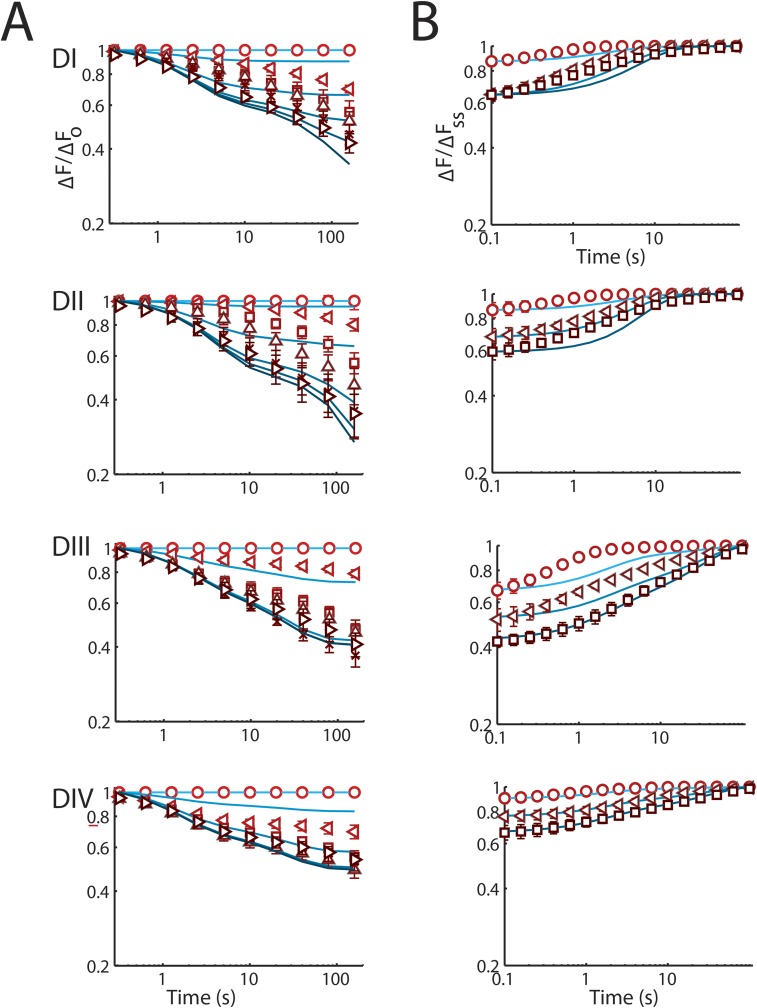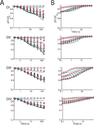Figure 8. Models of voltage-sensor slow immobilization. Experimental data are shown with symbols, and models are represented by solid blue lines. The effect of the protocol was removed for model fitting by subtracting the minimal changes in voltage-sensor activation observed with pulses to −100 mV. For fitting, experimental recovery is scaled so that it begins recovering from exactly the same fraction where onset terminated. Ionic current recovery is simulated using the same parameters and models used to simulate ionic onset (Table 5). These simplified models are qualitatively similar to the inactivation of the voltage sensors. (A) Model voltage-sensor slow immobilization for all four domains. (B) Model voltage-sensor recovery from slow immobilization for all four domains.