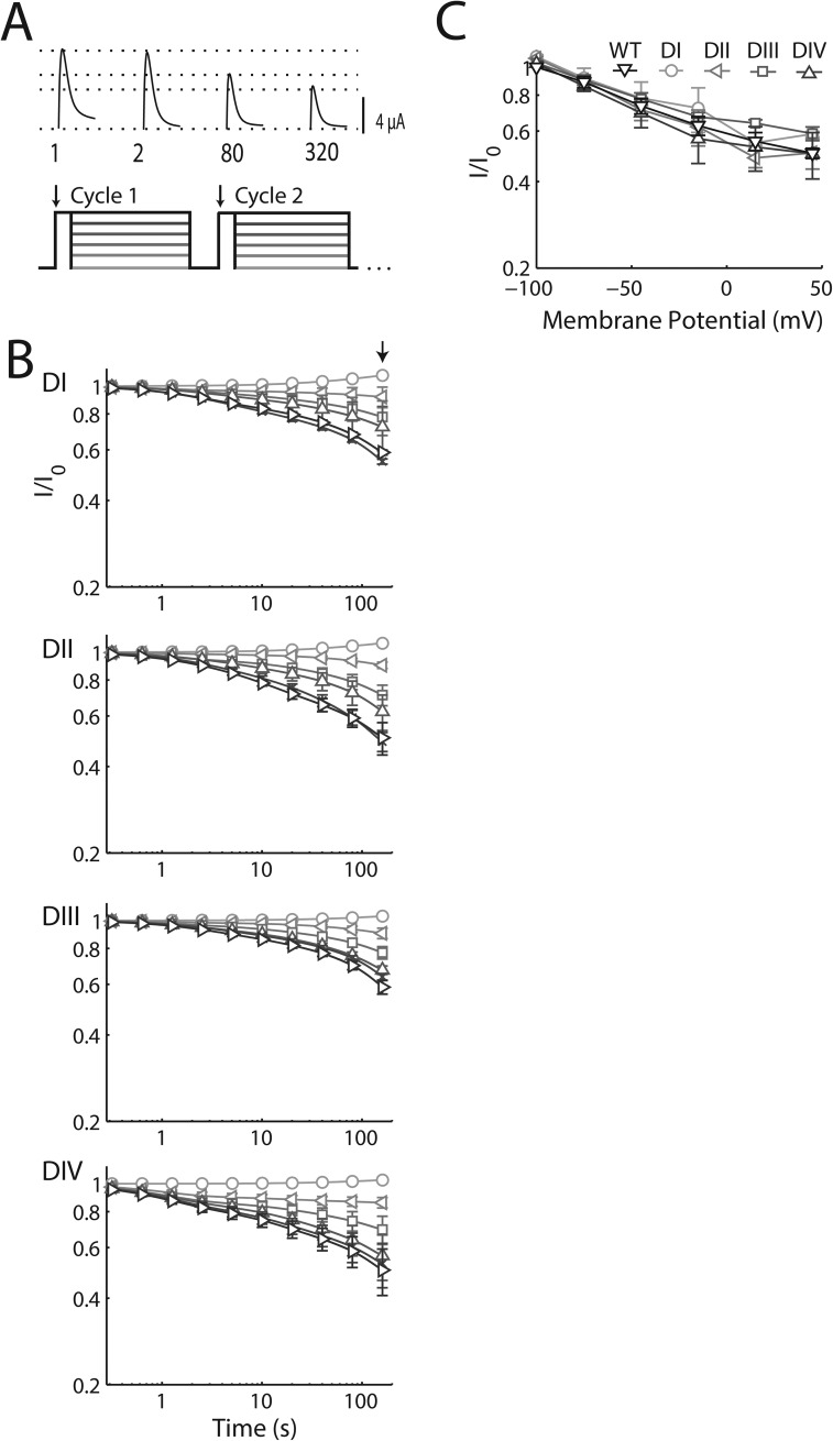 Figure 3. Single cysteine substitutions do not alter SI. Ionic currents for WT, DI-S216C, DII-S660C, DIII-L115C, or DIV-S1436C channels measured using the protocol in Fig. 2 A. Gating current is not subtracted from ionic current. Data for groups of four to six cells are shown as mean ± SEM. (A) Representative traces for the DI-S216C channel resulting from repetitive pulse to induce SI. (B) Voltage and time dependence of SI in the four mutant channels remain largely unchanged with the introduction of the cysteine and conjugation of the fluorophore (see C). (C) When a fluorophore is conjugated to each of four cysteine mutants, a slight shift to higher potentials in DI and DIII is observed compared with WT SI at 160 s. At +45 mV, this shift is seen as a trend for DI (P = 0.15) and significant for DIII (P < 0.05).