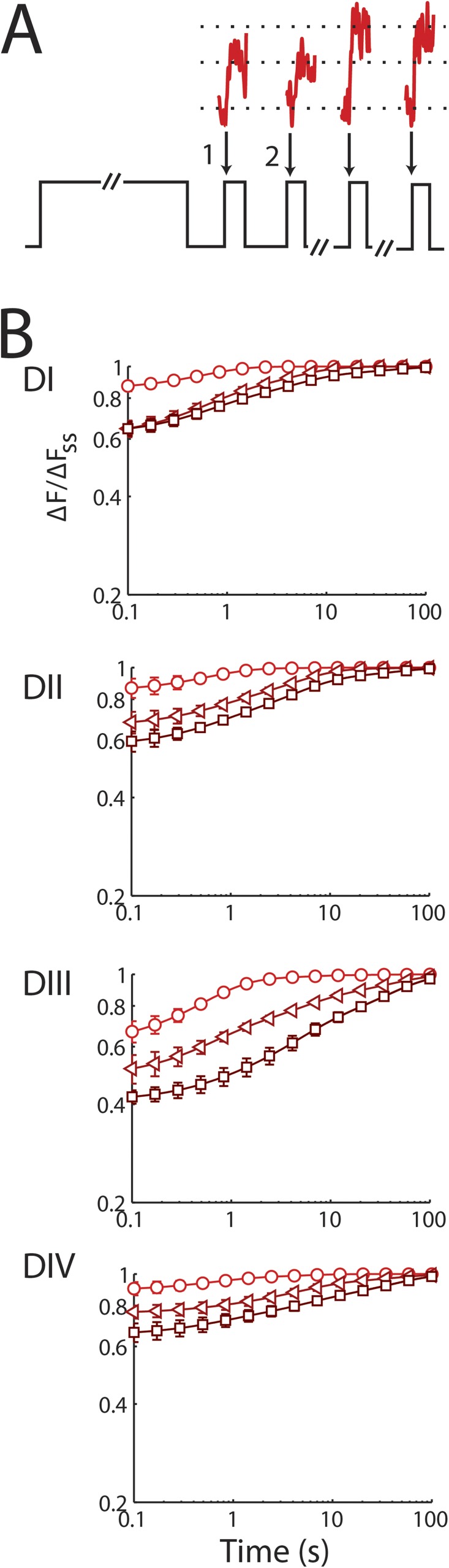 Figure 7. Recovery from SI is reflected in restored voltage-sensor mobility, especially DIII. Changes in fluorescence magnitude (ΔF/F0) studied as channels recover from SI. The mean ± SEM for groups of four to eight cells is reported. (A) Changes in ΔF/F0 with DI-S216C by the protocol shown in Fig. 6 A, with duration of 40 ms in phase b. (B) Voltage and cycle dependence of recovery from SI of ΔF/F0 for the four channels on log–log plots. Parameters are listed in Table 3; changes in DIII are notable.