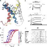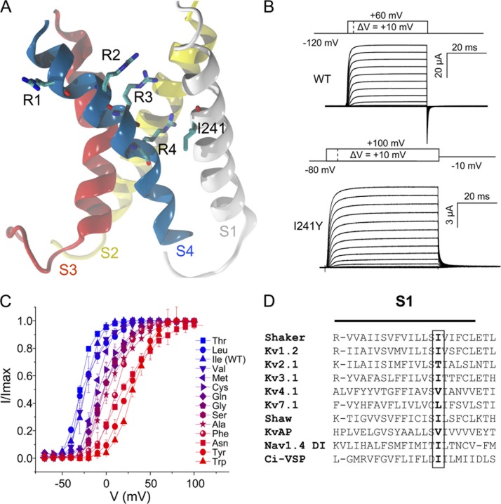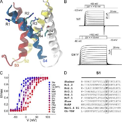 Figure 1. Effect of I241 mutations on Shaker channel gating. (A) Zoomed view of the refined structure of the Kv1.2 voltage sensor (PDB 3LUT; Chen et al., 2010) showing the S1 (white), S2 (yellow), S3 (red), and S4 (blue) helices, the four S4 Arg R1–R4 and the residues I241. (B) Ionic current traces for WT Shaker (top) and I241Y mutant (bottom) recorded using the indicated protocol. (C) G-V curves of Shaker channels as a function of the residue present at position 241. The curves are colored gradually from blue to red relative to their position on the voltage axis from negative to positive potentials. (D) Sequence alignments of the S1 segment (T-Coffee) showing the amino acid at the position homologue to I241 (boxed) in various voltage sensors containing proteins (Shaker, GI: 13432103; Kv1.2, GI: 4826782; Kv2.1, GI: 4826784; Kv3.1, GI: 76825377; Kv4.1, GI: 27436981; Kv7.1, GI: 32479527; Shaw, GI: 220901931; KvAP, GI: 38605092; Nav1.4 domain I, GI: 292495096 and Ci-VSP, GI: 76253898).