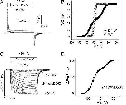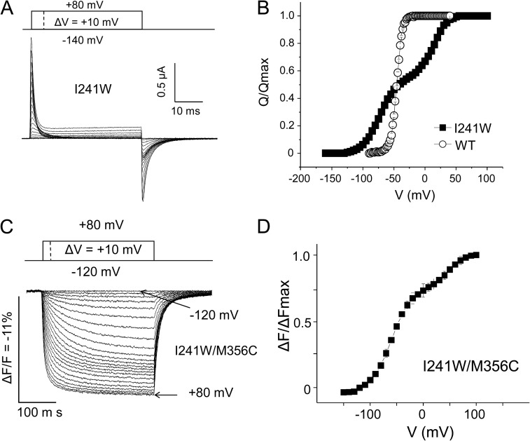 Figure 3. I241W transiently immobilizes S4. (A) Family of gating currents recording for the I241W mutant. (B) Q-V plots for the WT and I241W channels. (C) Family of fluorescence recordings of a tetramethylrhodamine-maleimide fluorophore attached to M356C in the I241W mutant. (D) F-V curve of the labeled I241W/M356C mutant obtained from an isochronal plot of the fluorescence intensities at the end of 300-ms test pulses.