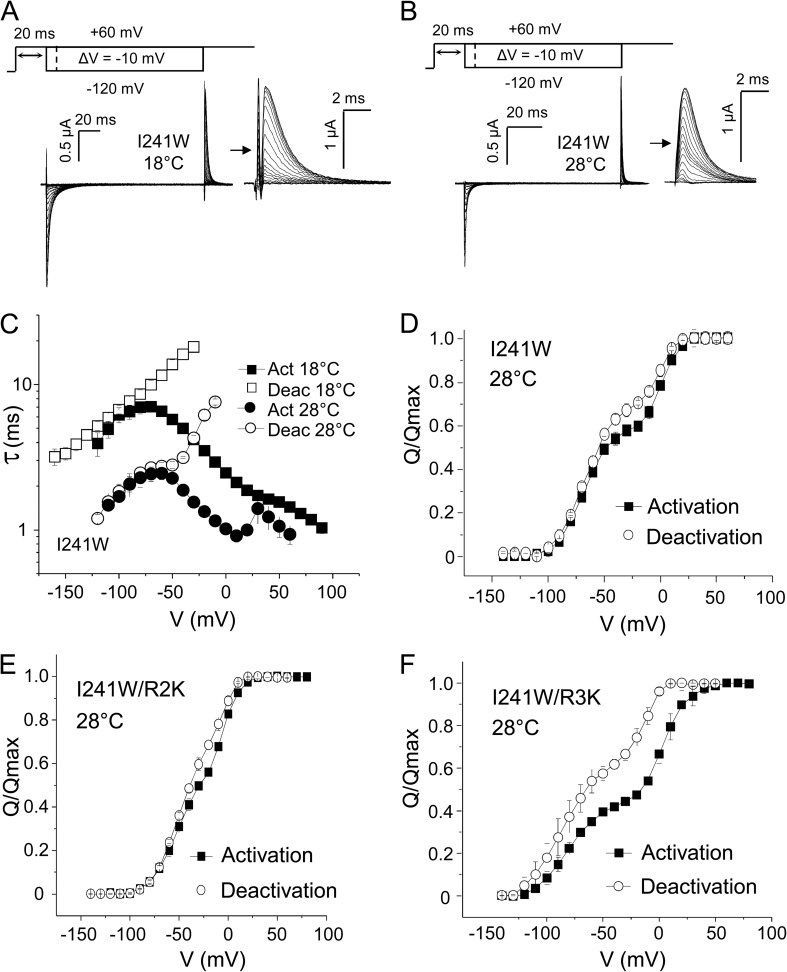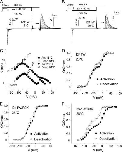 Figure 6. Conservation of the I241W phenotype during deactivation. (A) Deactivation gating current traces recorded in an oocyte expressing I241W channels with the indicated protocol at 18°C. (B) Deactivation gating currents traces recorded in the same cell at 28°C. Traces at the post-pulses in A and B are shown expanded for clarity. (C) τ-V curves of gating currents for the I241W mutant recorded at 18°C (black symbols) or 28°C (open symbols) during activation (circles) or deactivation (squares). (D) Q-V curves for the I241W mutant determined at 28°C during activation (black squares) or deactivation (open circles). (E) Q-V curves for the I241W/R2K mutant determined at 28°C during activation (black squares) or deactivation (open circles). (F) Q-V curves for the I241W/R3K mutant determined at 28°C during activation (black squares) or deactivation (open circles).