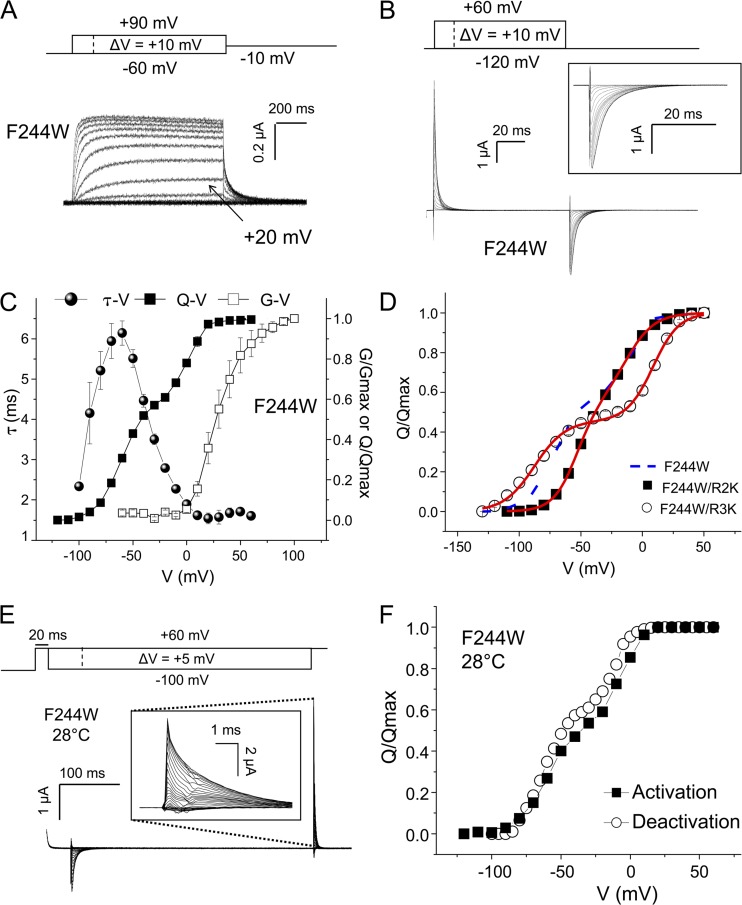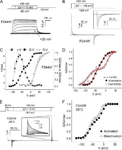Figure 7. The F244W mutation mimics the I241W mutation. (A) Ionic current traces recorded from the F244W mutant using the indicated activation protocol. (B) Gating current traces recorded from the F244W mutant using the indicated activation protocol. (C) Q-V (black squares), G-V (open squares), and τ-V of gating current (black spheres) plots for the F244W mutant determined from activation protocols. (D) Q-V curves for the double mutants F244W/R2K (black squares) and F244W/R3K (open circles) determined from activation protocols. The dotted blue line represents the Q-V curve of the F244W mutant depicted in C. The red lines represent the fit to a sequential double-Boltzmann equation. (E) Deactivation gating currents measured for the F244W mutant at 28°C. (F) Q-V curves determined at 28°C during activation (black squares) and deactivation (open circles) for the F244W mutant.