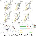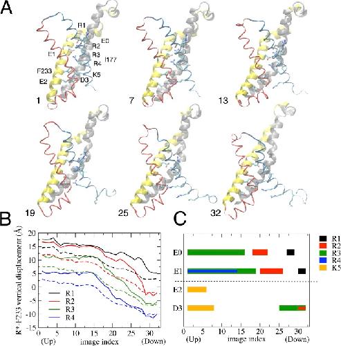 Figure 9. Simulation of the VSD trajectory using the string method. (A) The figure shows selected snapshots of VSD conformations along the converged path from the string method. The numbers indicate the positions from the initial linear path between the up (image #1) and down (image #32) states. The coloring method for S1–S4 is the same as in Fig. 1 A. The side chains of F233 (F290 in Shaker), I177 (I241 in Shaker) E0-2, D3, and R1–R4 are shown in all snapshots in licorice representation. (B) Vertical Z-distance of the S4 arginines relative to the center-of-mass of F233 side chain along the optimized path. The solid and dashed lines correspond to the distance relative to the R1–4 Cζ and R1–4 Cα, respectively. (C) Transient salt bridges analysis along the optimized path; according to the color code, a color corresponding to a particular arginine/lysine is drawn at an image if in the corresponding configuration there is a salt bridge between the basic and the acidic residue. The index of the images along the path is reported on the x-axis, and the acidic amino acids making interactions with the S4 arginines are reported on the y-axis. The horizontal dashed line schematically separates the extracellular region (above) from the intracellular (below).