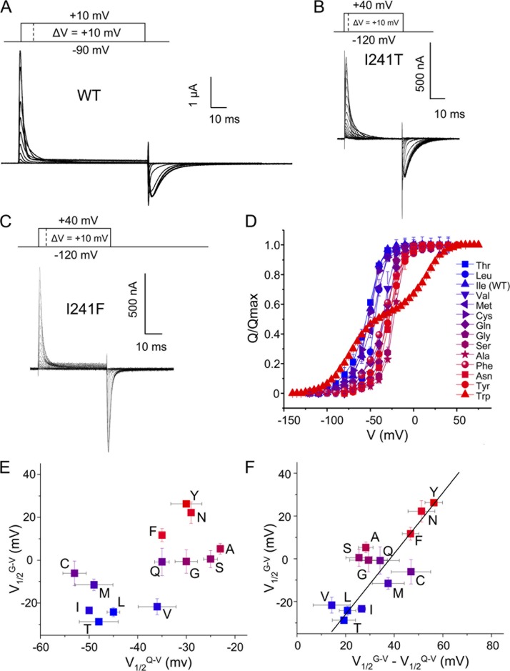 Figure 2. The I241 mutations alter VSD movement. The figure shows the gating currents traces for WT Shaker (A), the I241T (B), and I241F (C) mutants recorded using the indicated protocols. (D) Q-V curves for the WT and I241 mutants. (E and F) Correlation plots between the mid-points of the G-V (V1/2G-V) and Q-V (V1/2Q-V) (E) and between V1/2G-V and the difference V1/2G-V – V1/2Q-V (F). The line represents a linear fit to the data (R2 = 0.97). The coloring method in D–F is identical to Fig. 1 C.