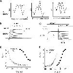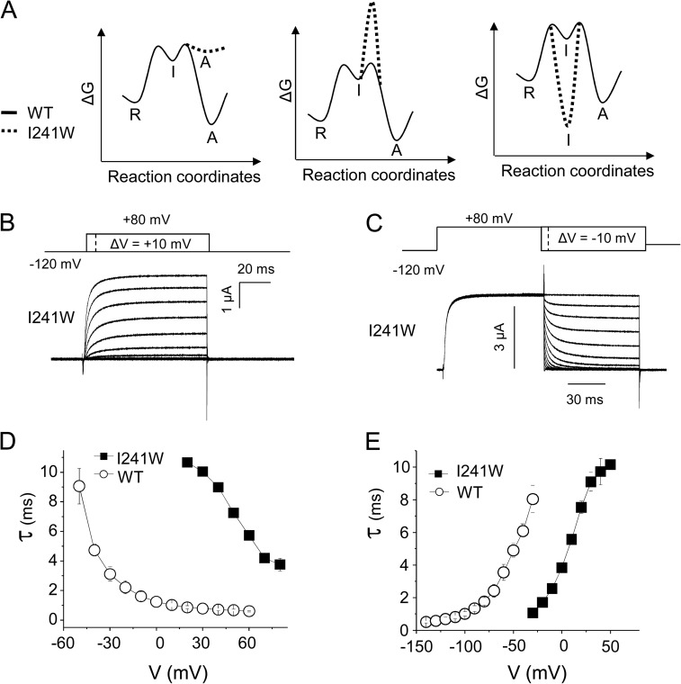 Figure 4. Hypothetical mechanisms for the I241W phenotype. (A) Hypothetical energy diagram of the VSD transitions showing the resting (R), intermediate (I), and active (A) states at a voltage of 0 mV. The dotted lines indicate possible effects of the I241W mutation: destabilization of the active state (left), increase of the energy barrier between the intermediate and active states (middle), and stabilization of the intermediate state (right). (B) Activation ionic currents recordings for I241W channels. (C) Deactivation ionic currents recordings for I241W channels. (D) τ–V plots for WT and I241W channels during activation. (E) τ–V plots for WT and I241W channels during activation.