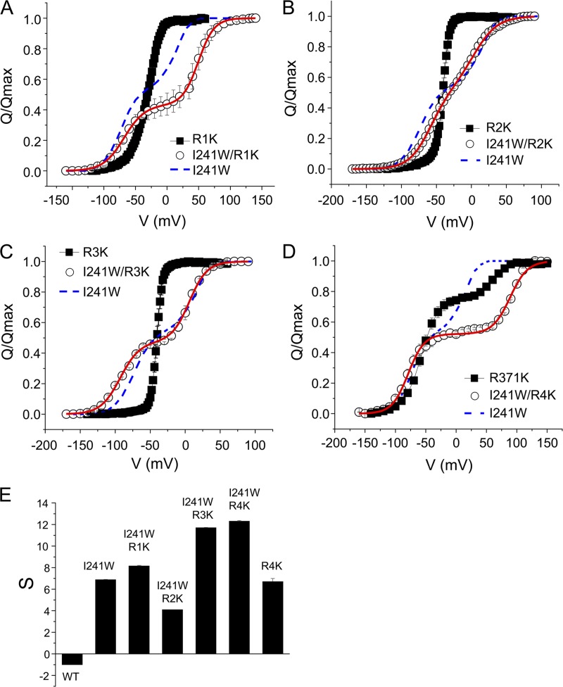 Figure 5. The I241W phenotype depends on the S4 Arg. The figure shows the Q-V curves measured during an activation pulse protocol for the mutants R1K (A, black squares), R2K (B, black squares), R3K (C, black squares), R4K (D, black squares), and the double mutants I241W/R1K (A, open circles), I241W/R2K (B, open circles), I241W/R3K (C, open circles), and I241W/R4K (D, open circles). In each graph, the dotted blue line represents the Q-V curve for the I241W mutant and the red line represents the fit to a sequential double-Boltzmann equation. (E) Histogram showing the s values (s = e0(V2z2 −V1z1)/kT) (see Table 1). A positive value indicates the presence of a stabilized intermediate state.