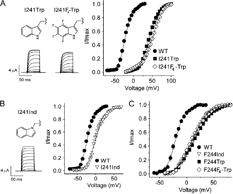 Figure 8. Investigations of the I241W and F244W mutants with nonnatural amino acids. (A, left) Representative current recordings of Shaker channel bearing the natural Trp or the unnatural F4-Trp side chain at position 241. 50-ms depolarizing pulses were used in 5-mV increments from −20 mV to +100 mV with a holding potential of −80 mV. (Right) G-V curves for WT I241 (black circles, V1/2 = −22.3 ± 0.6 mV; Z = 2.9 ± 0.3, n = 5), I241Trp (black squares, V1/2 = 41.9 ± 0.5 mV; Z = 1.9 ± 0.1; n = 5) and I241F4-Trp (open diamonds, V1/2 = 51.9 ± 1.3 mV; Z = 1.8 ± 0.2; n = 5). (B, left) Representative current recordings of Shaker channel bearing the Ind side chains at position 241. 50-ms depolarizing pulses were used in 5-mV increments from −60 mV to +60 mV with a holding potential of −80 mV. (Right) G-V curves for WT I241 (black circles, V1/2 = −22.3 ± 0.6 mV; Z = 2.9 ± 0.3; n = 5) and the I241-Ind mutant (open triangles, V1/2 = 0.6 ± 2.9 mV; Z = 2.5 ± 0.3; n = 6). (C) G-V curves of WT Shaker (black circles), the F244Trp mutant (black squares), the F244F4-Trp mutant (open diamonds), and the F244-Ind mutant (open triangles).