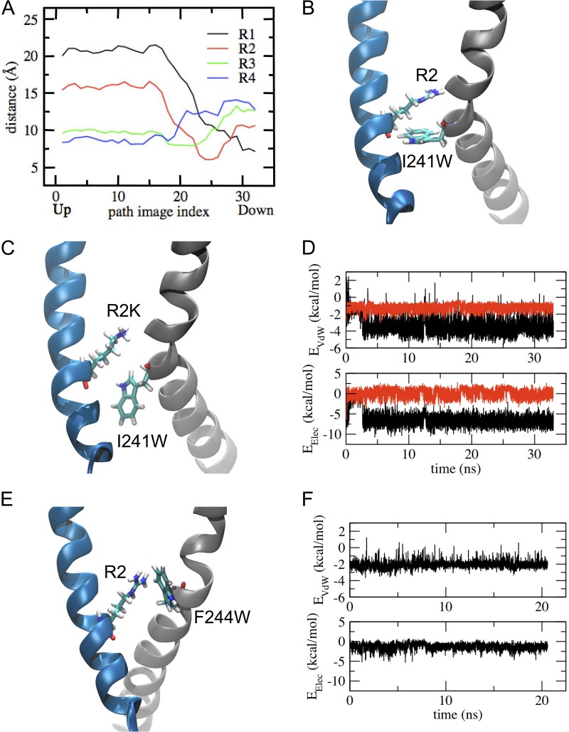 Figure 10. A possible mechanism for the I241W and F244W phenotypes. (A) Graph showing the distances between I241 (Cβ) and R1–R4 (Cζ) along the pathway obtained by the string method. The mutations I241W (B) and I241W/R2K (C) were independently introduced in silico in the conformation having the minimal I241-R2 distance (image #25) and equilibrated for 32 ns. Only the side chains were allowed to move during the two equilibrations. (D) The graph shows the vdW (top) and electrostatic (bottom) interaction energies between I241W and R2 (black) or between I241W and R2K (red) during the two simulations. (E) The mutation F244W was introduced in silico in image #22 giving the minimal F244-R2 (Cβ-Cζ) distance and equilibrated for 20 ns. The cartoon shows the side chains of R2 and F244W after equilibration. (F) The graph shows the vdW (top) and electrostatic (bottom) interaction energies between F244W and R2 during the simulation.
