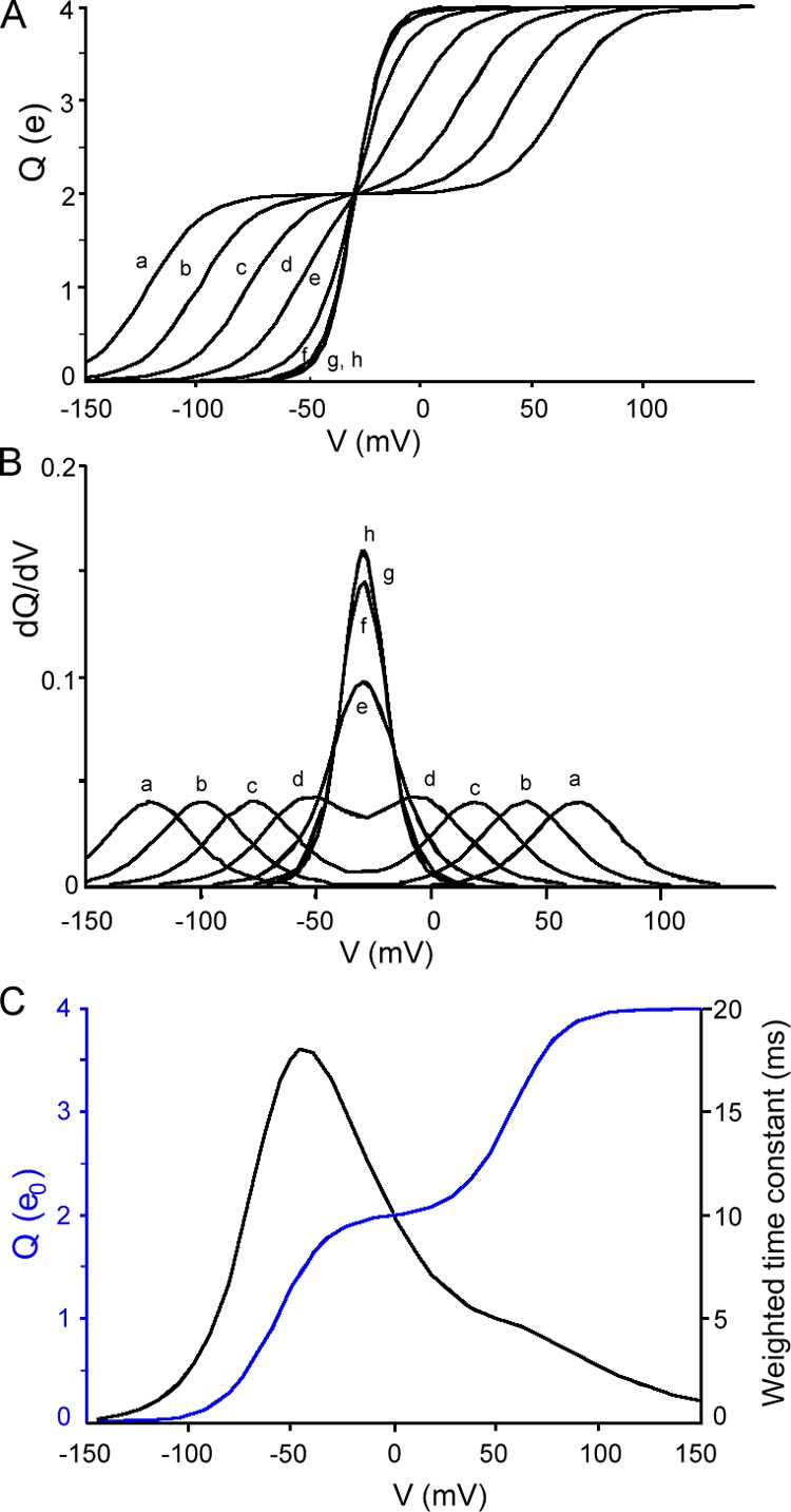 Figure 11. Simulations with the 3-state model. (A) Q-V curves computed for several values of K1 and K2, as follows (a): K1 = 0.0001, K2 = 166.7, s = 14.8; (b): K1 = 0.0004, K2 = 27.8, s = 11.2; (c): K1 = 0.0022, K2 = 4.63, s = 7.67; (d): K1 = 0.013, K2 = 0.77, s = 4.09; (e): K1 = 0.078, K2 = 0.129, s = 0.5. The next three curves are (f): K1 = 0.467, K2 = 0.021, s = −3.08; (g): K1 = 2.8, K2 = 0.0036, s = −6.66; and (h): K1 = 16.8, K2 = 0.0006, s = −10.25. Curves e–h can be well fit by a single Boltzmann given apparent valences of 2.36, 3.54, 3.91, and 3.99, respectively. (B) First derivative of the Q-V curves shown in part A. (C) Q-V and weighted time constant versus V curves computed with the 3-state model with the following parameters: z1f = 0.5, z1b = 1.5, z2f = 1.2, z2b = 0.8, α10 = 0.1, β10 = 0.001, α20 = 0.001, β20 = 0.1.