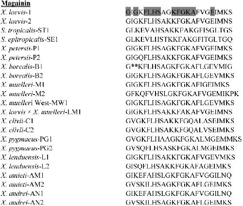 Figure 1. Primary structures of the magainin peptides isolated from skin secretions of frogs belonging to the genera Xenopus and Silurana. The amino acid sequence of magainin-ST1 was deduced from the corresponding nucleotide sequence of genomic DNA. In order to maximize structural similarity, gaps denoted by * have been introduced into some sequences. Strongly conserved residues are shaded.