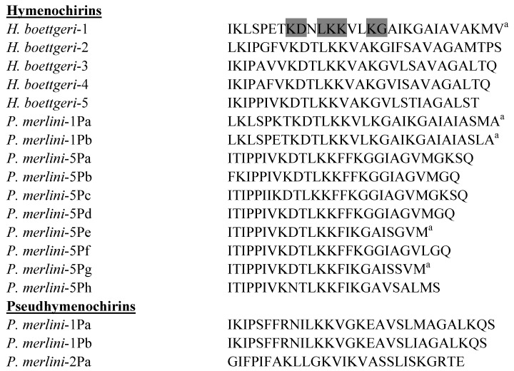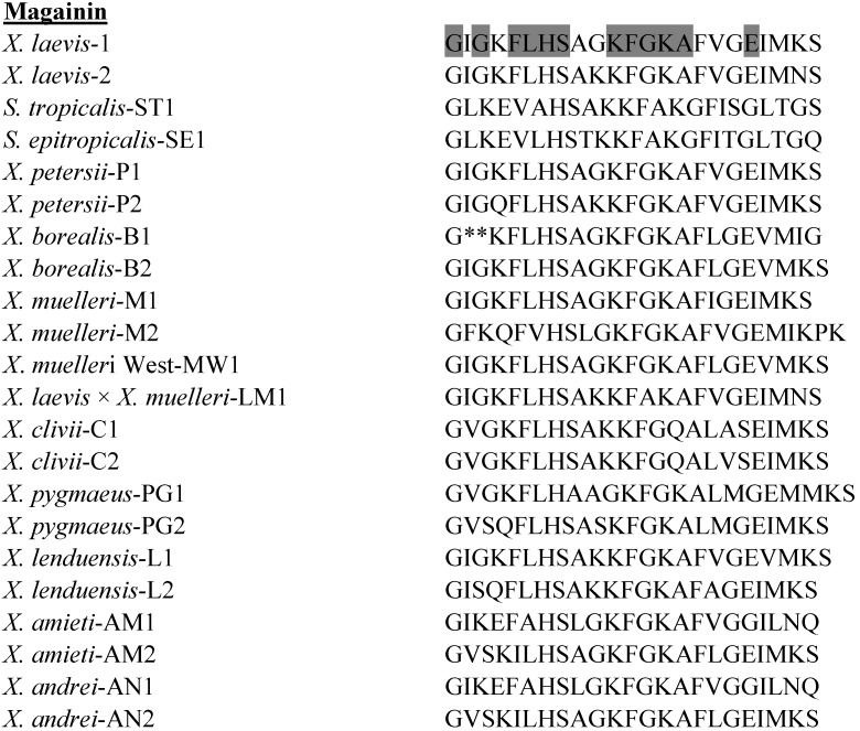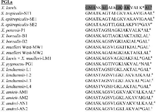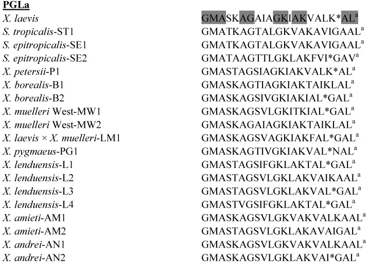 Figure 2. Primary structures of the peptide glycine-leucine-amide (PGLa) peptides isolated from skin secretions of frogs belonging to the genera Xenopus and Silurana. a denotes C-terminal α-amidation. In order to maximize structural similarity, gaps denoted by * have been introduced into some sequences. Strongly conserved residues are shaded.
