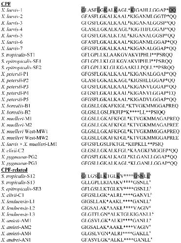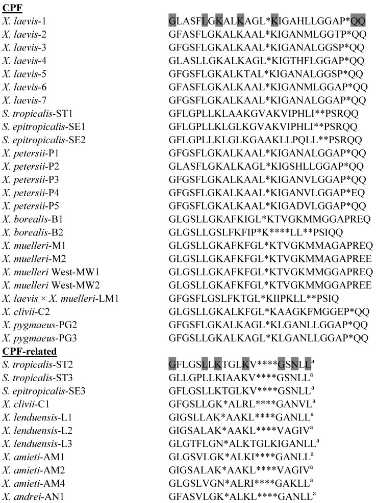 Figure 3. Primary structures of the caerulein precursor fragment (CPF) peptides isolated from skin secretions of frogs belonging to the genera Xenopus and Silurana. a denotes C-terminal α-amidation. In order to maximize structural similarity, gaps denoted by * have been introduced into some sequences. Strongly conserved residues are shaded.