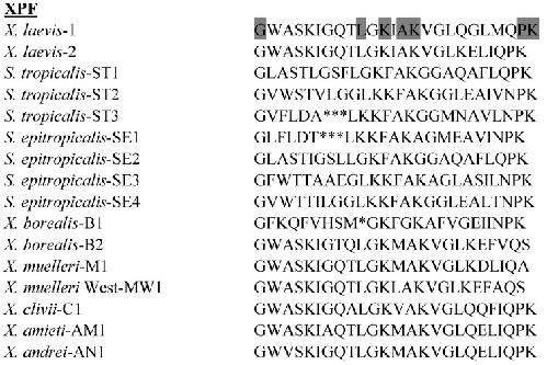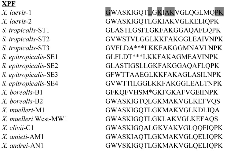 Figure 4. Primary structures of the xenopsin precursor fragment (XPF) peptides isolated from skin secretions of frogs belonging to the genera Xenopus and Silurana. In order to maximize structural similarity, gaps denoted by * have been introduced into some sequences. Strongly conserved residues are shaded.