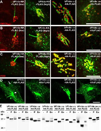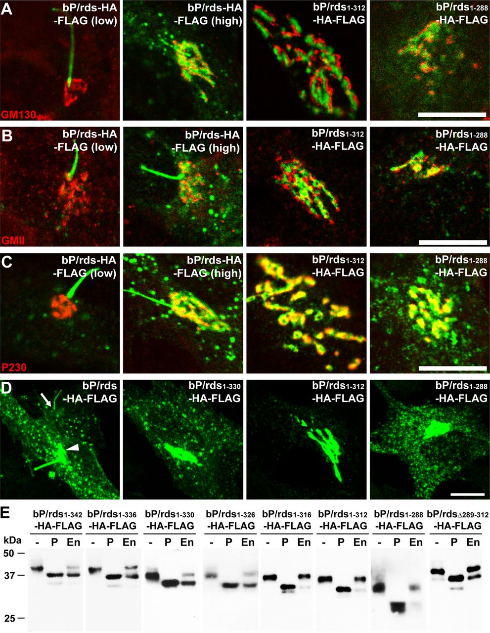 Figure 6. C-terminal tail region of P/rds is essential for Golgi retention. A–C, hTERT-RPE1 cells transiently expressing full-length or CT-truncated bP/rds (green) were colabeled for GM130 (A; cis-Golgi), for GMII (B; medial and trans-Golgi), or for P230 (C; TGN). The images are confocal images of a single x–y plane. D, Maximum projection images of bP/rds and CT truncations. bP/rds is concentrated in cilia when the expression level is low (arrow) and localized to Golgi and other parts of cells except cilia when the expression level is high (arrowhead). CT truncation, down to the position 312, led to the accumulation of P/rds in the Golgi apparatus. Further truncation to position 288 led to exit of P/rds from the Golgi. Scale bars, 10 μm. E, CT-truncated bP/rds transiently expressed in hTERT-RPE1cells were treated with PNGase F (P) or Endo H (En). Truncation of the CT tail led to acquisition of Endo H resistance. Therefore, P/rds is capable of serving as a substrate for the GMII. |