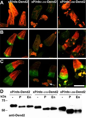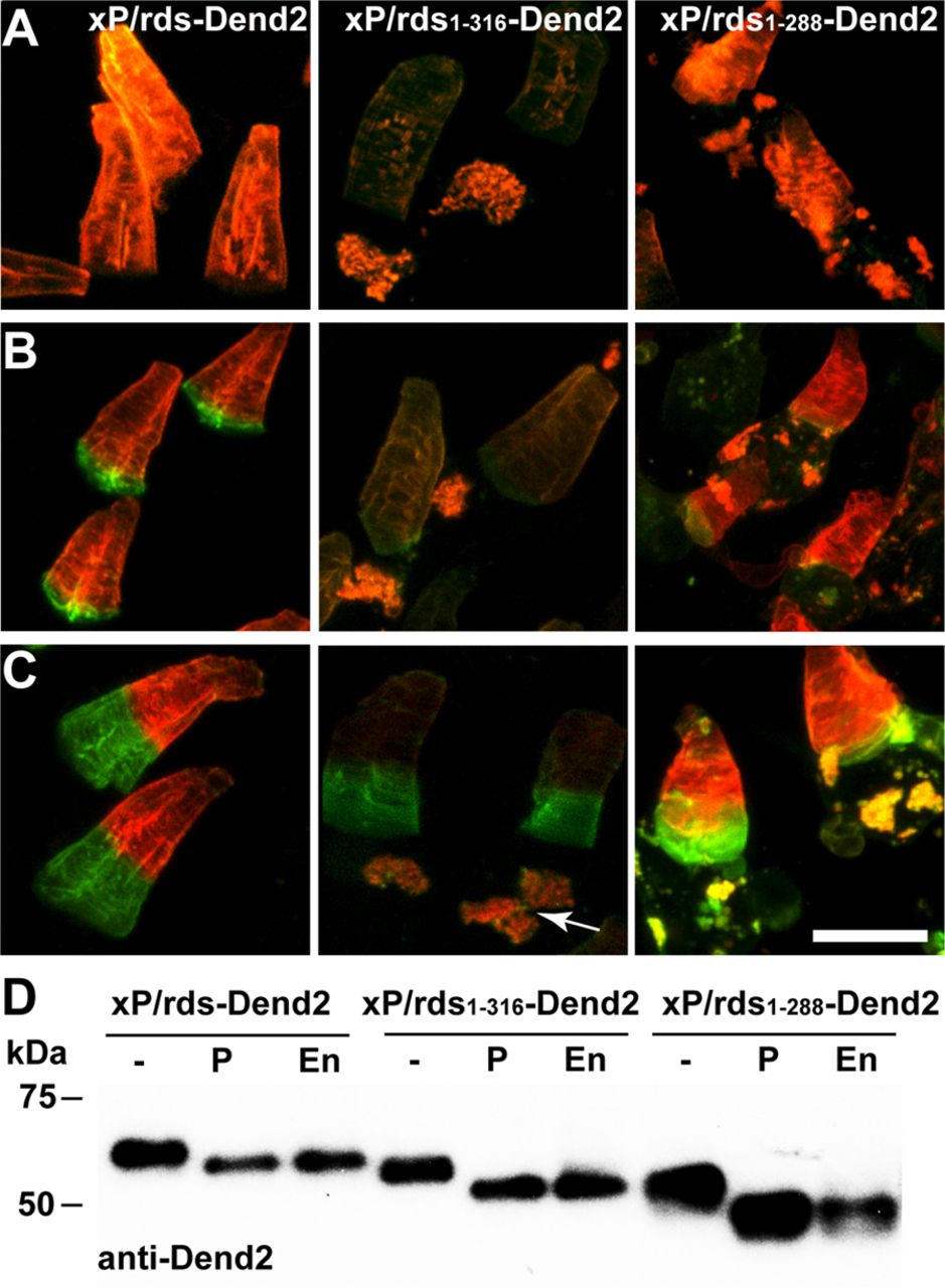 Figure 10. CT-truncated P/rds retained in IS are slow in renewal. AâC, Dend2 fluorescence of live retinal explants (maximum projections) 0 h (A), 4 h (B), or 48 h (C) after photoconversion. xP/rds1-316 in the IS does not exit the Golgi apparatus for >48 h. D, PNGase F (P) and Endo H (En) analysis of tadpole eyes expressing full-length and CT-truncated P/rds. CT-truncated P/rds are sensitive to Endo H similar to full-length P/rds. Animals were 10 d old in AâC and 14â15 d old in D. |