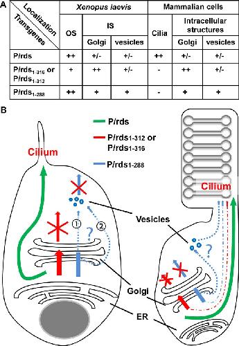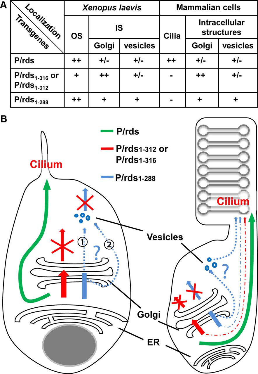 Figure 11. Model for unconventional cilia targeting of P/rds. A, The summarized localizations of P/rds and the CT truncations in photoreceptor cells and mammalian cells. ++, +, +/−, and − indicate that the transgenes' signals were strong, weak, very weak, and undetectable, respectively. Note: When overexpressed in mammalian cells, P/rds can also be detected in Golgi and other intracellular compartments. B, In both mammalian cells (left) and X. laevis rods (right), P/rds bypasses the Golgi apparatus, either the later portions or altogether, to reach the cilia, thus taking an unconventional secretory pathway (green arrow, P/rds). The Golgi retention signal prevents conventional secretion of P/rds1-312 or P/rds1-316 (red arrow, P/rds1-312 or P/rds1-316), but does not block unconventional cilia targeting in rods (red dash-dotted arrow), likely due to trafficking driven by oligomerization with endogenous P/rds. After release from Golgi (left, blue dotted arrow, P/rds1-288), P/rds1-288 is incapable of taking the secretory pathway in mammalian cells (left, blue arrow). Routes labeled 1 and 2 are the estimated routes explaining the cell-line-dependent variability observed between hTERT-RPE1 and IMCD3 cells. Neither 1 or 2 is a complete secretory pathway and cannot deliver P/rds1-288 to the cell surface. P/rds1-288 can reach the cilium through unconventional secretion in rods (right, blue dotted and dash-dotted arrows). |