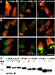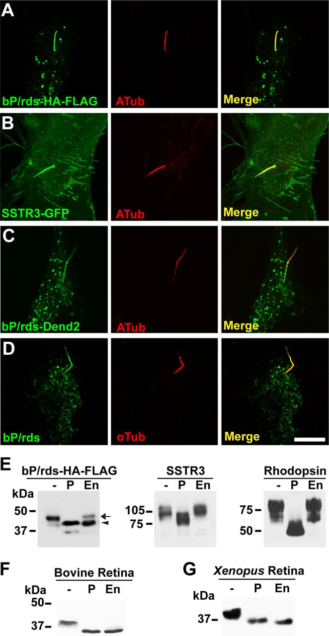 Figure 1. Cilia targeting of P/rds in hTERT-RPE1 cells. A–D, bP/rds with HA and FLAG tags (A), SSTR3-GFP (B), bP/rds-Dend2 (C), or bP/rds (D; green) colocalized with acetylated tubulin (ATub, red) or α tubulin (αTub, red) in the primary cilia of hTERT-RPE1 cells. E, When expressed in hTERT-RPE1 cells, the majority bP/rds was Endo H (En] sensitive, whereas SSTR3 and rhodopsin were Endo H resistant. F, G, Endogenous bovine P/rds (F; detected by mAb anti-bovine P/rds) and endogenous X. laevis P/rds (G; detected by mAb anti-X. laevis P/rds) were sensitive to Endo H (En]. P/rds, SSTR3, and rhodopsin were all sensitive to PNGase F (P), confirming that they are glycoproteins. Arrow indicates the position of the Endo H-resistant form of P/rds; arrowhead indicates the position of EndoH-processed P/rds. The images are confocal images of a single x–y plane. Scale bar, 10 μm. |