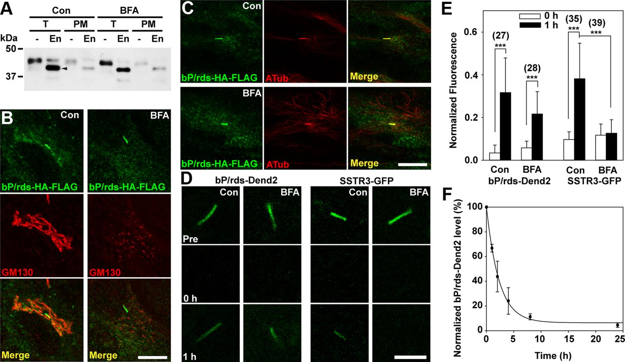 Figure 2. Brefeldin A causes resorption of cis-Golgi structure to ER, but does not abolish the cilia targeting of P/rds. A, Western blot analysis of BFA (0.5 μg/ml for 4 h)-treated hTERT-RPE1 cells stably expressing bP/rds-HA-FLAG. Total cell lysate (T), and cell surface fraction (PM) isolated by biotinylation method were treated with Endo H (En). BFA treatment led to abolishment of the small amount of the Endo H-resistant form of P/rds on the cell surface. The arrowhead indicates the position of Endo H-processed P/rds. B, bP/rds (green) was colabeled with anti-GM130 (cis-Golgi, red) in the absence (Con) and presence (BFA) of BFA treatment. BFA treatment caused GM130 redistribution, which indicates the disruption of cis-Golgi structures. C, bP/rds (green) was colabeled with anti-acetylated tubulin (red) in the absence (Con) and presence (BFA) of BFA treatment. Cilia localization of bP/rds was maintained after BFA treatment. D, E, Trafficking of bP/rds-Dend2 or SSTR3, stably expressed in hTERT-RPE1 cells, was tested by FRAP in the absence (Con) and presence of (BFA) treatment. D, One hour after photobleaching, P/rds recovered in the cilia of control cells. P/rds recovered in 50% of cilia treated with BFA. Under the same conditions, SSTR3 recovery was blocked by BFA treatment. E, The amounts of cilia localized P/rds and SSTR3 immediately following and 1 h after photobleaching. The amount was normalized to the prebleach levels. Significant recovery of bP/rds-Dend2, but no significant recovery of SSTR3, was observed in BFA-treated cells. ***p < 0.001 by MWRST. The data are represented as mean ± SD. The numbers of cilia analyzed from at least three sample preparations are indicated in parentheses. F, Cells stably expressing bP/rds-Dend2 were treated with 150 μM cycloheximide for up to 24 h and then analyzed for the bP/rds-Dend2 protein level by Western blots. The half-life of bP/rds-Dend2 is estimated to be ∼1.8 h. The images are confocal images of a single x–y plane. Scale bars: B and C, 10 μm; D, 5 μm. |
