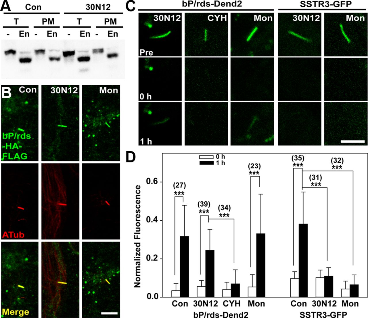 Figure 3. Trans-Golgi exit is not essential for cilia targeting of P/rds. A, B, hTERT-RPE1 cells stably expressing bP/rds-HA-FLAG were treated with 0.5 μM 30N12 or 1 μM monensin, which block the function of trans-Golgi structures, for 4 h. A, The samples treated with 30N12 were analyzed by Western blots. Total lysate (T) and cell surface fraction (PM) were also treated with Endo H (En). After 30N12 treatment, the small amount of the Endo H-resistant form of P/rds on PM became nearly undetectable. B, bP/rds (green) was colabeled with anti-acetylated tubulin (red) with (30N12, Mon) or without (Con) treatment. Cilia localization of bP/rds was maintained after 30N12 or monensin treatment. C, D, The trafficking of bP/rds-Dend2 or SSTR3-GFP, stably expressed in hTERT-RPE1 cells, was tested by FRAP in the absence of (Con) and presence of 30N12 (30N12) or monensin (Mon). The effect of cycloheximide (CYH) treatment was also tested on the trafficking of bP/rds-Dend2. C, One hour after photobleaching, P/rds recovered in the cilia of 30N12- or monensin-treated cells. Under the same conditions, SSTR3 recovery was blocked by 30N12 or monensin treatment. P/rds recovery was blocked by CYH treatment, suggesting that protein synthesis is required for P/rds recovery in cilia. D, The amounts of cilia-localized P/rds and SSTR3 immediately following and 1 h after photobleaching. The amount was normalized to the prebleach levels. Significant recovery of bP/rds-Dend2 was observed in 30N12- or monensin-treated cells, but not in CYH-treated cells. SSTR3 recovered in untreated control cells; however, the recovery was blocked by 30N12 or monensin. Therefore, 30N12 and monensin blocks the conventional trafficking of SSTR3 effectively, but does not block the unconventional trafficking of P/rds. The data are represented as mean ± SD. ***p < 0.001 by MWRST. The numbers of cilia analyzed from at least three sample preparations are indicated in parentheses. The images are confocal images of a single x–y plane. Scale bars, 5 μm. |