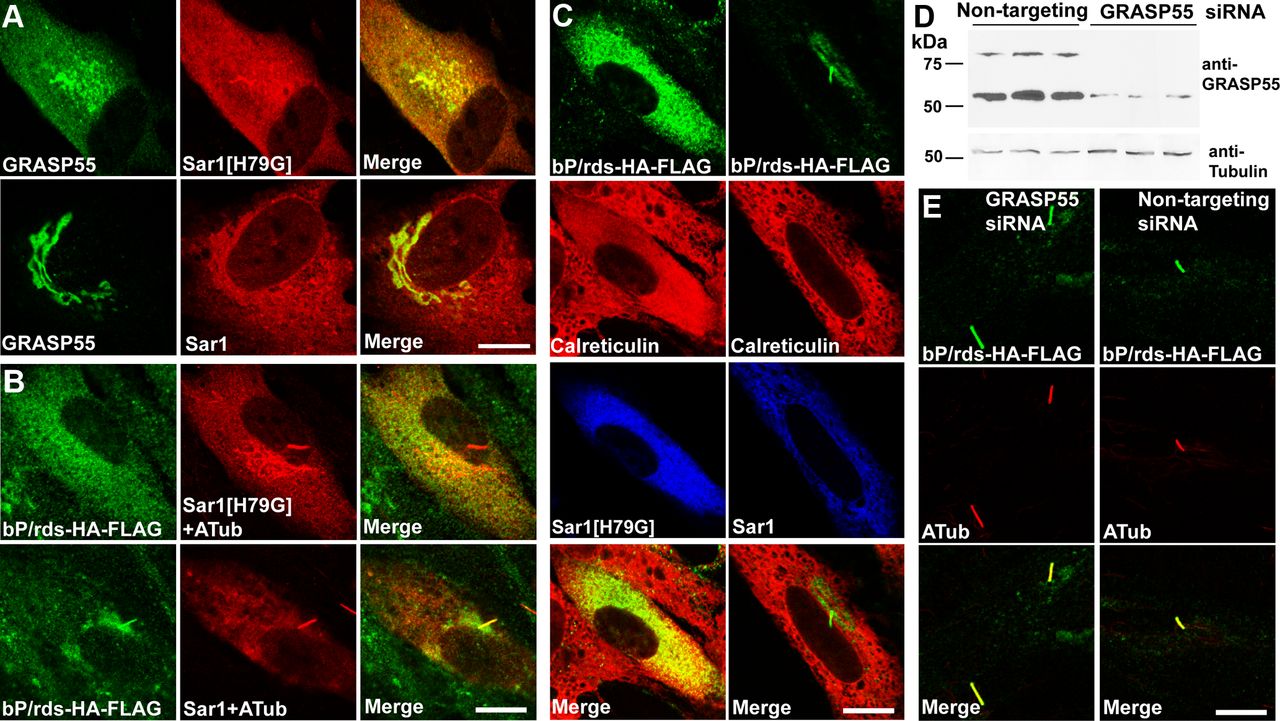 Figure 4. Cilia targeting of P/rds in cilia is dependent on COPII, but not on the GRASP55-mediated mechanism. A, Cells stably expressing bP/rds that are also transiently expressing either wild-type or the H79G mutant of Sar1 (red) were colabeled with anti-GRASP55 (green). Expression of Sar1(H79G), but not wild-type Sar1, caused the disruption of cis-Golgi structure. B, P/rds (green) was colabeled with wild-type or the H79G mutant of Sar1 (red). The primary cilia is also labeled by anti-acetylated tubulin (red, the same color as Sar1). Cilia targeting of P/rds was inhibited by Sar1(H79G). C, P/rds (green) was colabeled for Sar1 (blue) and calreticulin (red, an ER marker). P/rds localized in ER in the cell expressing Sar1(H79G). D, E, Cells stably expressing bP/rds were transfected with GRASP55 siRNA and then analyzed for GRASP55 protein level (D) and the localization of P/rds (E; green) in primary cilia (acetylated tubulin, red). The siRNA effectively reduced the protein expression of GRASP55 by more than 10-fold, but did not affect the cilia targeting of P/rds. The images are confocal images of a single x–y plane. Scale bars, 10 μm. |