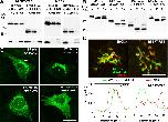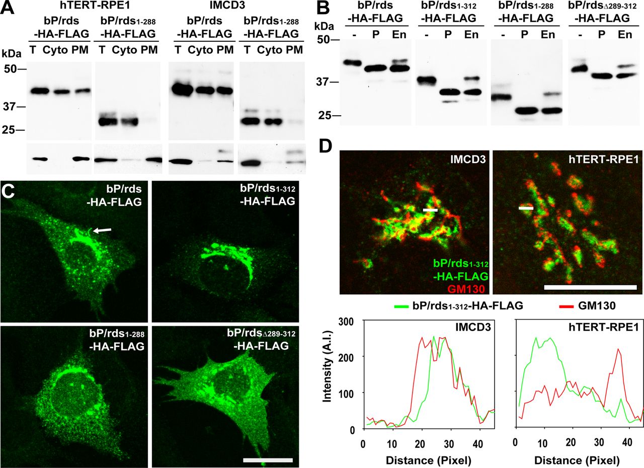 Figure 7. Unconventional cilia targeting of P/rds in IMCD3 cells. A, hTERT-RPE1and IMCD3 cells stably expressing bP/rds or bP/rds1-288 were separated into cytoplasm (Cyto) and plasma membrane (PM) fractions by the biotinylation method and analyzed by Western blots. bP/rds1-288 is barely observed in the plasma membrane. Na+/K+ ATPase (bottom) was used to demonstrate that the plasma membrane proteins were pulled down effectively. B, PNGase F (P) and Endo H (En) treatments of IMCD3 cells stably expressing bP/rds or its truncation mutants. C, Maximum projection images of full-length and CT-truncated bP/rds expressed in IMCD3 (green). The arrow indicates the cilium. D, Top, IMCD3 and hTERT-RPE1 cells stably expressing bP/rds1-312 (HA, green) were labeled for a cis-Golgi marker GM130 (red). Bottom, Intensity of bP/rds1-312 and GM130 (arbitrary intensity units, AI) along the white bars shown in the top. Significant overlap between bP/rds1-312 and cis-Golgi was observed in IMCD3 cells, whereas the overlap is less significant in hTERT-RPE1 cells. Scale bars, 10 μm. |