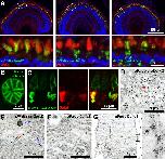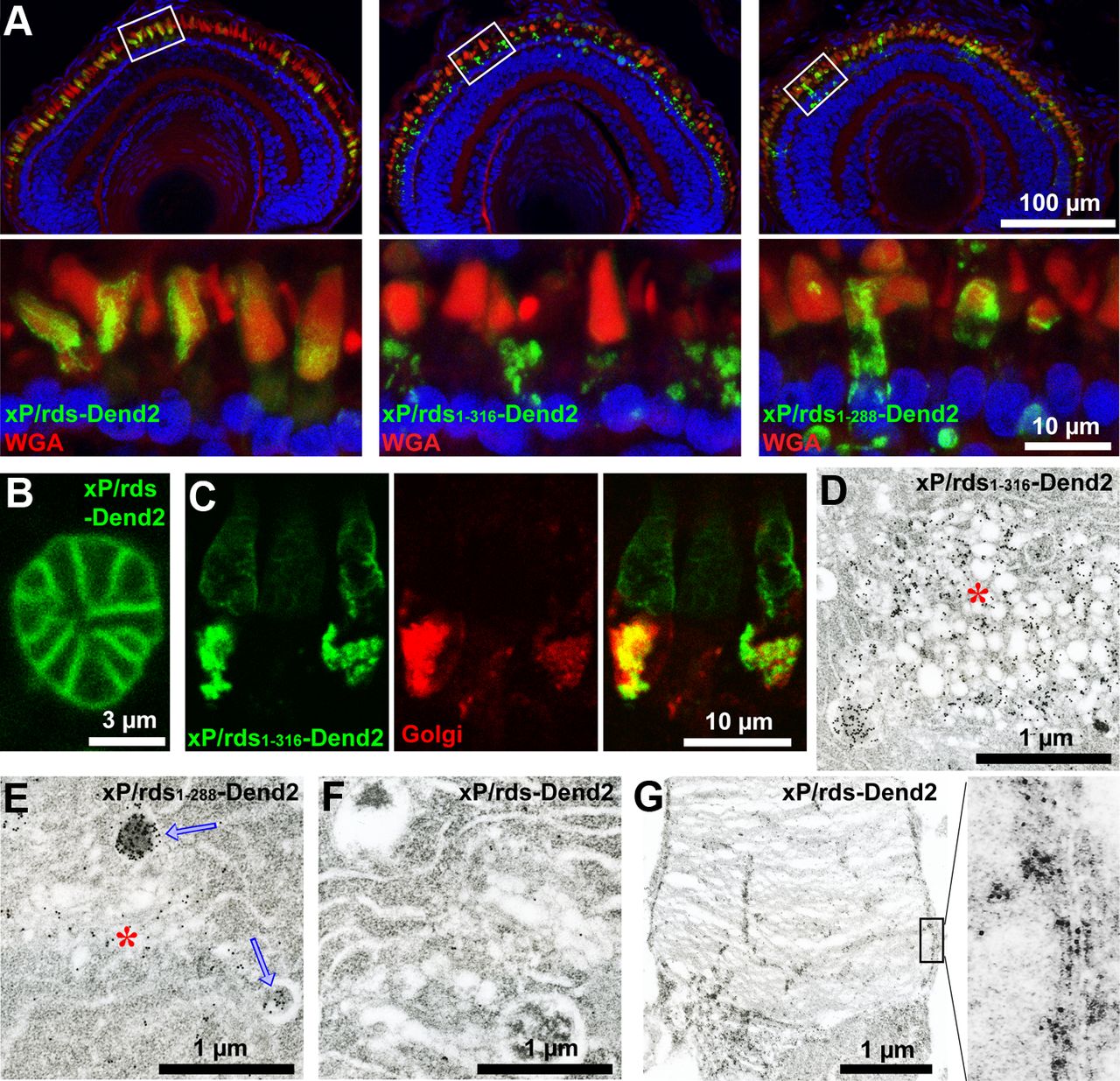 Figure 8. Mislocalization of CT-truncated xP/rds in rods. A, Localization of full-length or CT-truncated P/rds (green) in X. laevis rods. OS areas are labeled by wheat germ agglutinin (WGA, red). Nuclei are in blue. The bottom row of images are magnified views of the selected areas above. B, xP/rds-Dend2 (green) is localized to disk rims and incisures. C, xP/rds1-316-Dend2 (green) colocalizes with the turquoise Golgi marker (red). D–G, Immunoelectron microscopy localization of CT-truncated and full-length P/rds. D, xP/rds1-316-Dend2 mislocalizes in Golgi apparatus. E, xP/rds1-288-Dend2 mislocalizes in electron-dense vesicles of the IS. F, xP/rds-Dend2 does not localize in IS. G, xP/rds-Dend2 localizes in rim and incisures of OS. Asterisks indicate Golgi apparatus and arrows indicate electron dense vesicles. Animals were 14–15 d old. |