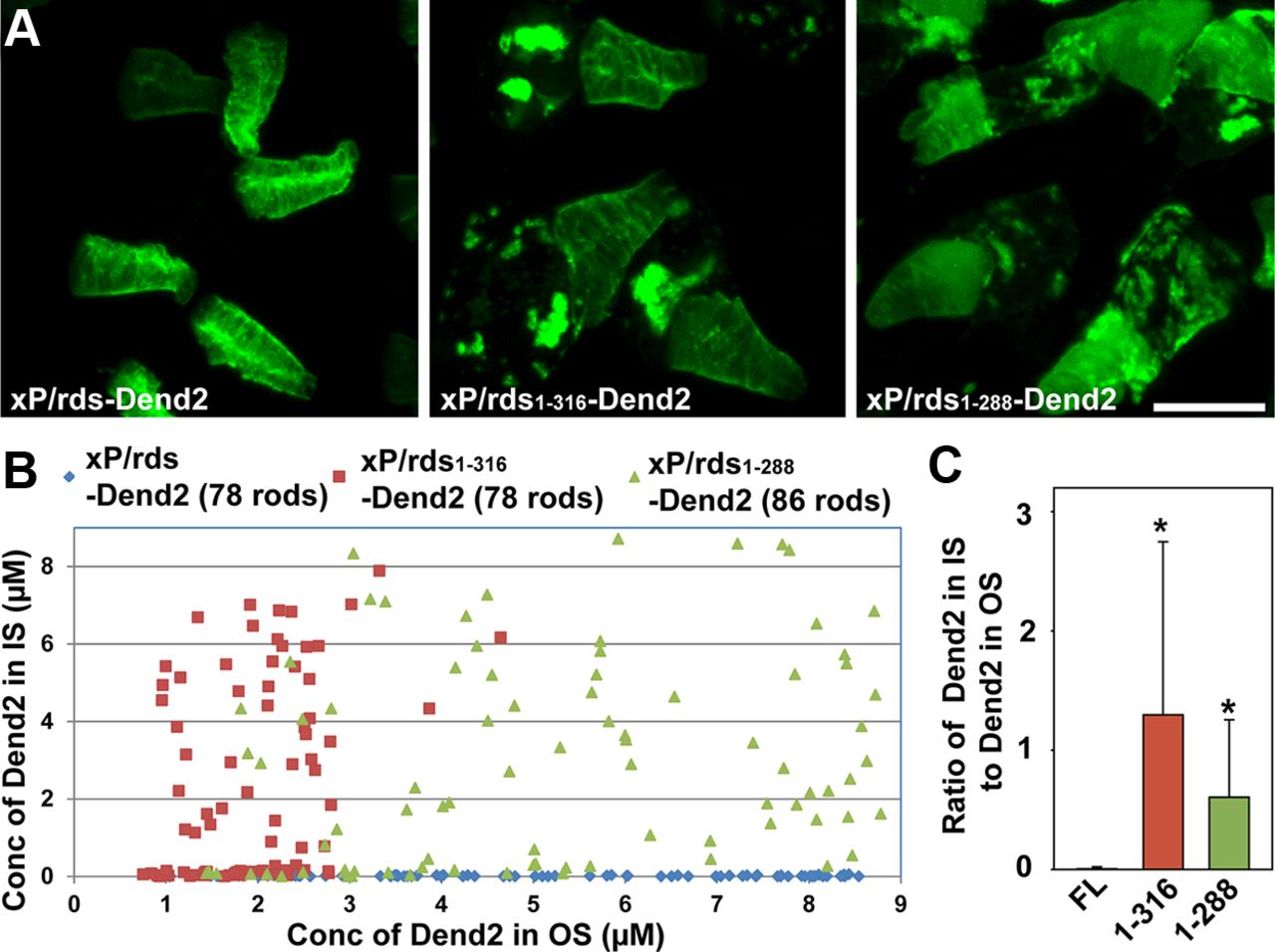 Figure 9. Quantitative analysis of P/rds mislocalization in X. laevis rods. A, Localization of P/rds and its truncation mutants in unfixed retinas (maximum projections). Scale bar, 10 μm. B, Concentrations (Conc) of Dend2 fusion proteins were measured for OS and IS structures of individual rods. The numbers of rods analyzed for each transgene construct are shown in parentheses. Those rods originated from three individual tadpoles for each transgene construct. C, The IS/OS concentration ratio was analyzed for each transgene. FL, xP/rds-Dend2; 1–316, xP/rds1-316-Dend2; 1–288, xP/rds1-288-Dend2. The data are represented as mean ± SD. p < 0.001 compared with xP/rds-Dend2 by MWRST. Animals were 9–10 d old. |