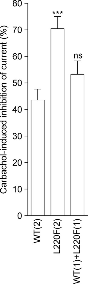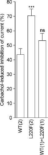 Figure 5. L220F affects phosphatidylinositol 4,5-bisphosphate (PIP2)-dependent gating of ROMK. Whole-cell potassium currents recorded in Xenopus oocytes coexpressing the M1 receptor with ROMK channels comprising wild type (WT) and/or L220F mutant subunits. Relative doses are given in parentheses. Data are expressed as the percent inhibition of the potassium current induced by exposure (10 min) to carbachol (25 μmol/L) and are mean ± SEM (n = 12–15 oocytes/group, from three frogs). ***P < 0.001; ns, P > 0.05 versus inhibition of WT potassium current.