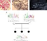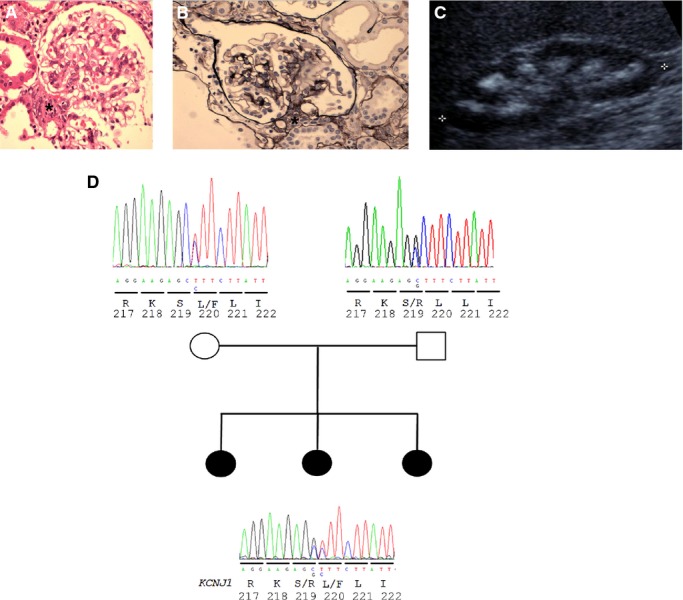 Figure 1. Clinical and molecular genetic analysis of Bartter's syndrome patients. Hyperplasia of juxtaglomerular apparatus is demonstrated on renal histology in (A) sibling 1 and (B) sibling 2. (C) Renal USS demonstrates nephrocalcinosis in sibling 3. (D) KNCJ1 sequencing identifies compound heterozygous mutations in all three affected p.S219R/p.L220F segregating from each parent.
