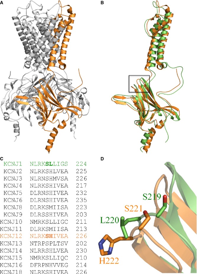 Figure 2. Homology modeling of ROMK. (A) Crystal structure of chicken Kcnj12/Kir2.2 (Hansen et al. 2011). One of the four Kcnj12 monomers forming the potassium channel is highlighted in orange. (B) Putative structure of the ROMK monomer (green) compared with chicken Kcnj12 (orange). The black box denotes the position of S219 and L220 in ROMK. (C) Partial amino acid sequence alignment of the human KCNJ family. (D) Putative position of S219 and L220 in ROMK and the homologous residues in chicken Kcnj12 (S221 and H222, respectively).