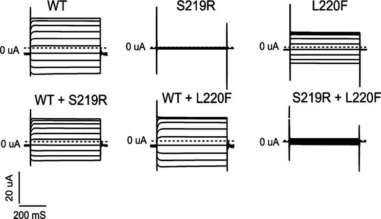 Figure 3. Comparison of the properties of wild-type (WT) and mutant ROMK channels in Xenopus oocytes. Shown are families of whole-cell currents in oocytes injected with ROMK cRNA-encoding WT, mutant cRNA (S219R and L220F), or combinations of both to mimic heterozygosity and compound heterozygosity. Oocytes were held at −60 mV and clamped in 20 mV increments from −120 mV to +60 mV in 20 mV steps (5 mmol/L potassium).