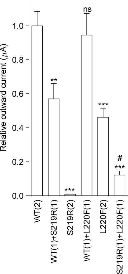 Figure 4. Effect of S219R and L220F mutations on ROMK channel activity. Relative outward potassium currents recorded by two-electrode voltage -clamp in Xenopus oocytes expressing ROMK. Oocytes were injected with 250 pg cRNA-encoding wild type (WT), S219R, or L220F mutant channel subunits. To mimic the compound heterozygous state of the patients, oocytes were coinjected with mixtures (given in parentheses) of the different cRNAs (250 pg in total). Data are mean ± SEM (n = 18 oocytes/group, from three frogs). ***P < 0.001; **P < 0.01; ns, P > 0.05 versus WT potassium current. #P < 0.001 versus WT+S219R current.