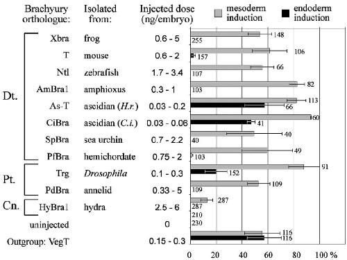 Fig. 1. Quantitative analysis of endoderm and striated muscle induction in response to misexpression of different Brachyury orthologues. Histogram showing