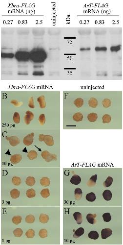 endodermin transcript. The embryos were injected with 250 pg (B), 10 pg (C), 3 pg (D), or 1 pg (E) of the Xbra-FLAG mRNA; or with 30 pg (G) and 10