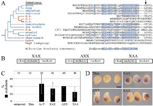 Fig. 5. Endodermal determinants are contained both within the T-box and within its upstream domain. (A) Sequence alignment of the N-terminal amino acids