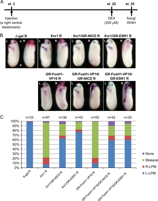 Fig. 1. The Xnr1-dependent transcriptional complex is a potential target of Notch signaling. (A) The experimental strategy. (B) One pg Xnr1 or 50 pg GR-FoxH1-VP16 RNA were injected into a rightventralblastomere of 4-cell-stage embryos with or without 2 ng GR-NICD or 1 ng GR-ESR1 RNA. DEX was added into the culture medium at stage 22. The expression of Pitx2 at stage 25 was tested by whole mount in situ hybridization. (C) The quantitative assessment of the injections in (B). At least three independent experiments were performed. ânâ indicates the number of injected embryos. R: Injection into the right side of embryo.