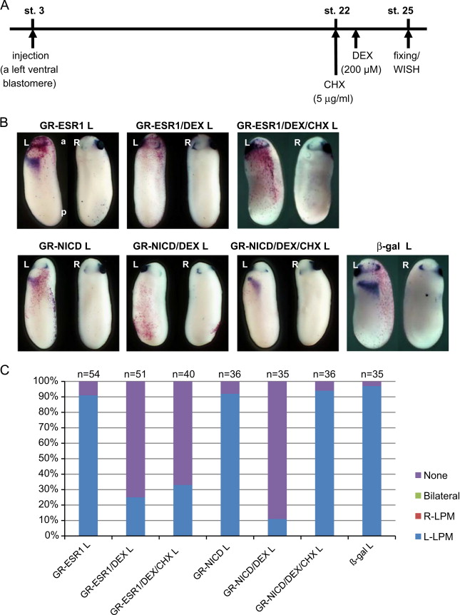 Fig. 2. ESR1 directly blocked the expression of Pitx2 gene in the leftLPM. (A) The experimental strategy. (B) One ng GR-NICD or 1 ng GR-ESR1 RNA was injected into a leftventralblastomere of 4-cell-stage embryos. DEX was added into the culture medium at stage 22 and CHX was added 30 min before the addition of DEX. (C) The quantitative assessment of the injections in (B). At least three independent experiments were performed. ânâ indicates the number of injected embryos. L: Injection into the left side of embryo.