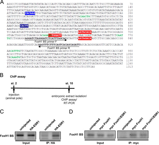 Fig. 3. ESR1 and FoxH1 independently bind to the ASE region in Pitx2 gene. (A) Nucleotide sequence of the ASE region in Xenopus Pitx2 gene. Three FoxH1-binding sites (red boxes), one N-box (blue box) and five E-boxes (green letters) are indicated within the ASE region. (B) The experimental strategy of ChIP assay. (C) One ng HA-ESR1 RNA was injected into 2-cell-stage embryos, and embryonic extracts were isolated at stage 10 for ChIP analysis. ChIP assays were performed using α-HA antibody. (D) One ng myc-FoxH1 RNA was injected into 2-cell-stage embryos with or without 1 ng flag-ESR1 RNA, and nuclear extracts were isolated at stage 10 for ChIP analysis. ChIP assays were performed using α-myc antibody.