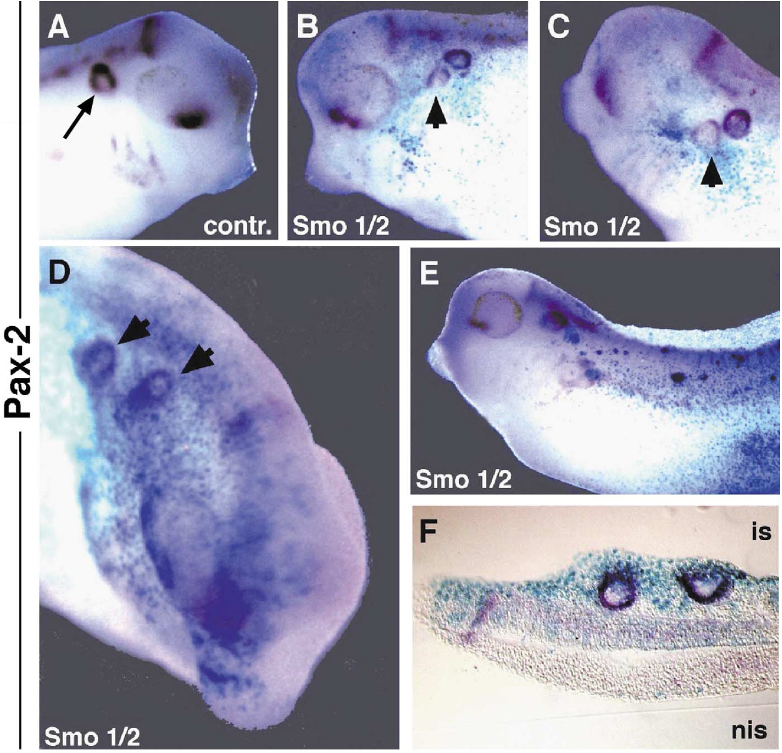 embryonic stage 36 and stained for XPax-2 expression (purple) by whole-mount in situ hybridization. Lateral (A�C, E) and dorsolateral (D) views of injected