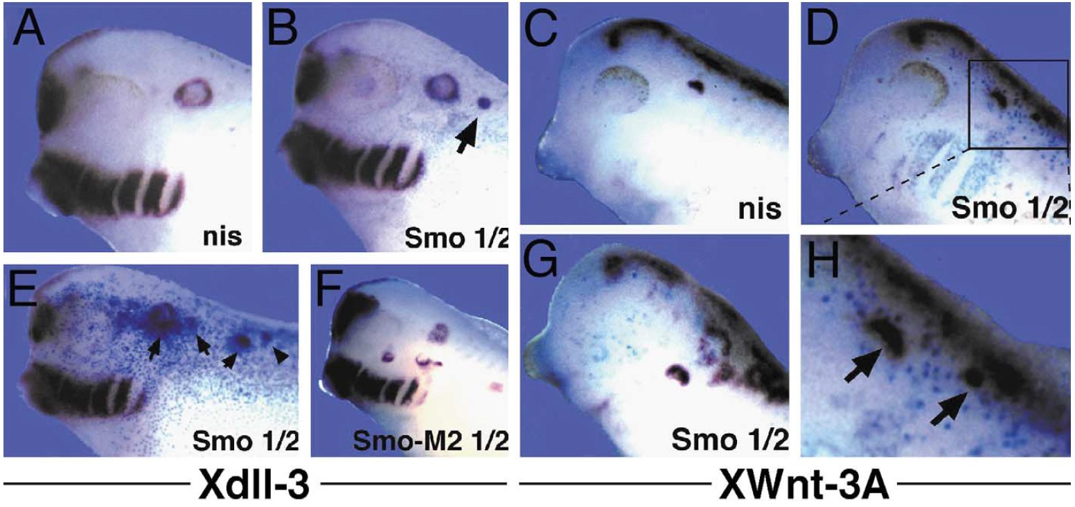 XSmo-M2 (F) mRNA (1.5 ng/embryo each, one of two cells) and stained for Xdll-3 (A, B, E, F) or Xwnt-3A (C, D, G, H) expression. Ectopic vesicles in