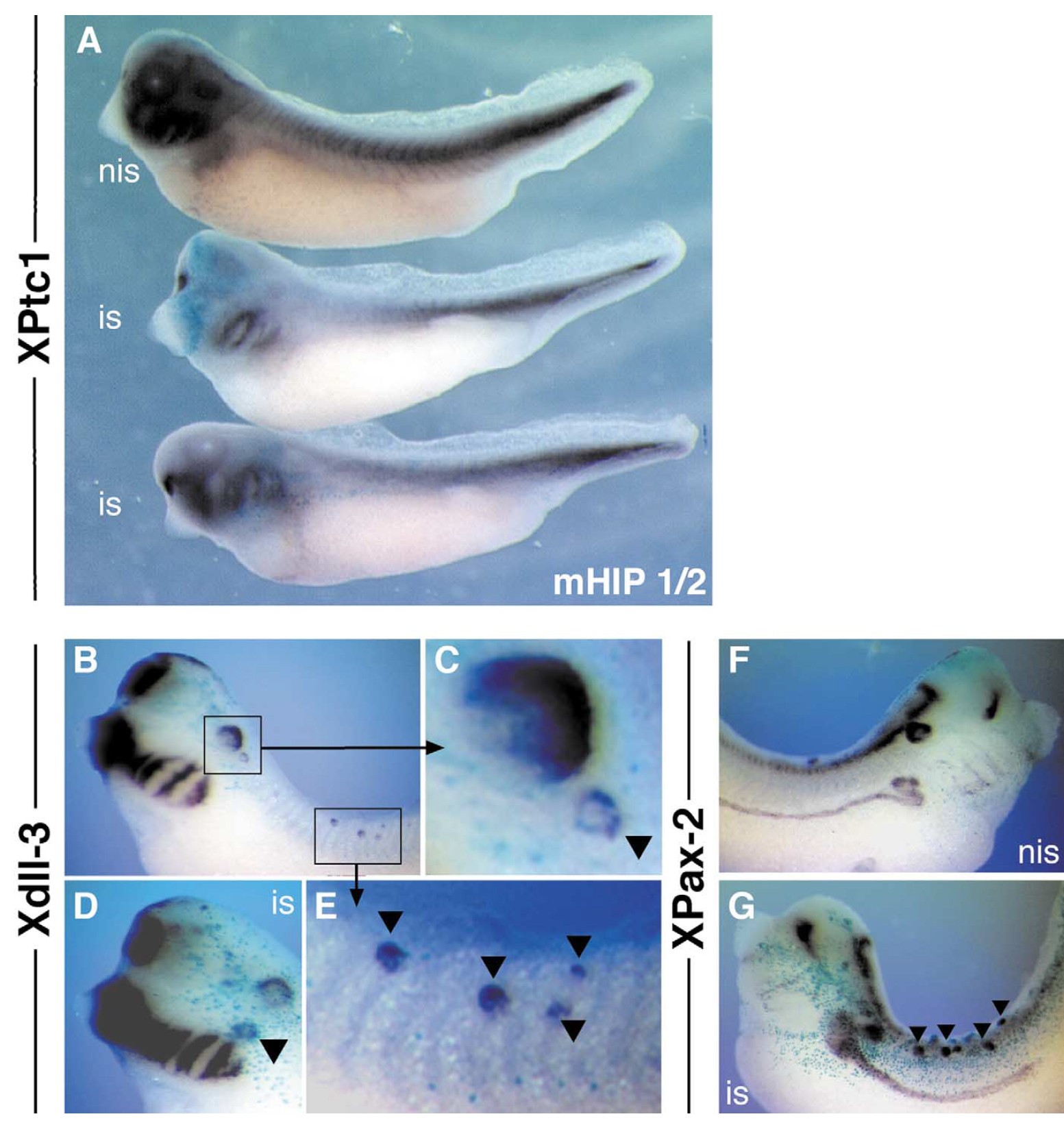 fixed at stage 38 (A) or stage 36 (B-G) and stained for expression of XPtc1 (A), Xdll-3 (B-E), or XPax-2 (F, G). mHIP-injected embryos (n 24) exhibit